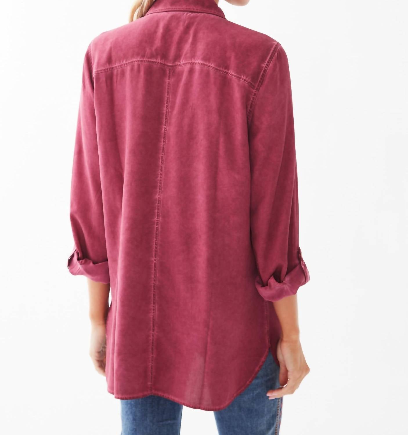 Perfectly tailored and soft to the touch. Elevate your wardrobe with the Pigment Dyed Button Front Shirt by FDJ, an essential for stylish versatility. Crafted with long sleeves featuring a button tab for rolling, it's made of 100% viscose for a soft touch. The shirt's design includes a button front, classic collar, and practical patch pockets on the breast, finished with a curved hemline that's shorter on the sides and longer at the back. Care instructions: machine wash cold inside out with like colors, tumble dry low, iron inside out on low. Length: 27 inches.