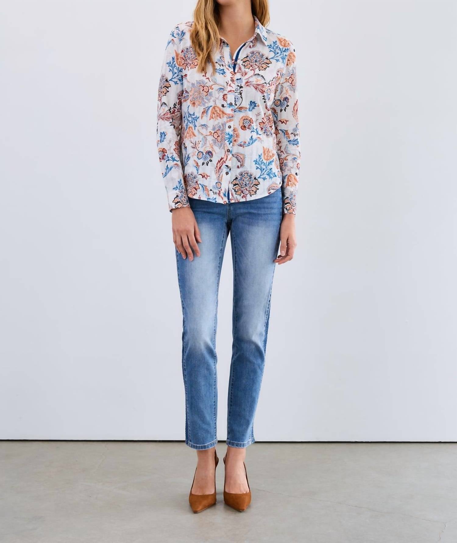 A classic button down shirt that will never go out of style. Discover effortless elegance with the Women's Classic Long Sleeve Top by FDJ, crafted in a chic ivory hue with a floral pattern. Perfect for a vacation or adding a touch of boho chic to your spring wardrobe, this top features a collared neckline and button closure. Designed as a button-down shirt with long sleeves, it represents a seamless blend of style and comfort.