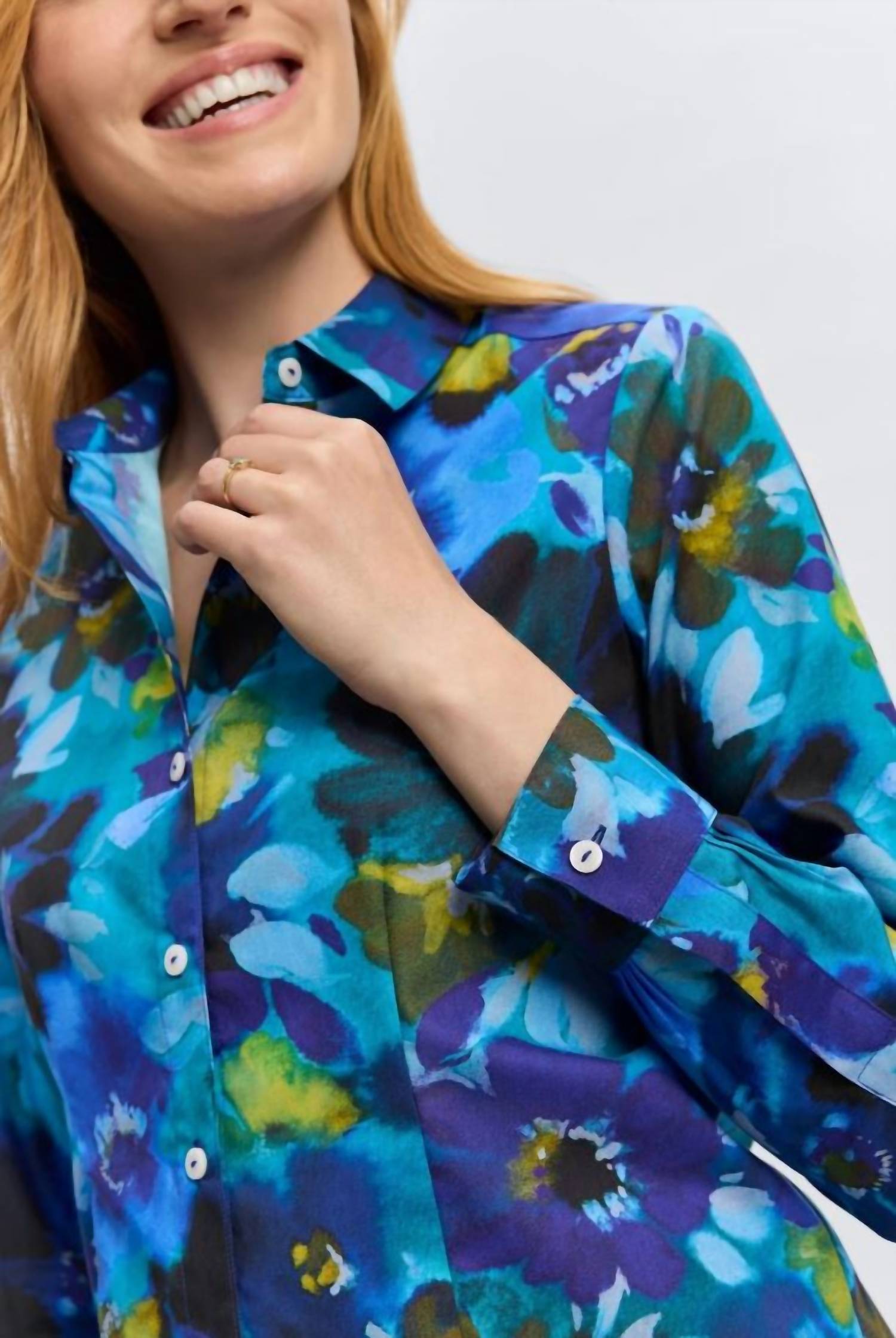 Perfectly tailored and soft to the touch. Discover the June Painterly Floral Blouse by Foxcroft, a chic and tailored addition to your wardrobe. This women's button-down shirt features long sleeves and a collar, crafted from 100% Cotton Poplin for a comfortable and breathable fit. Designed with a button closure and adorned with an abstract floral pattern in shades of blue, green, and gold, it offers a stylish maximalist look perfect for spring engagements. Care is easy with machine wash and tumble dry instructions.