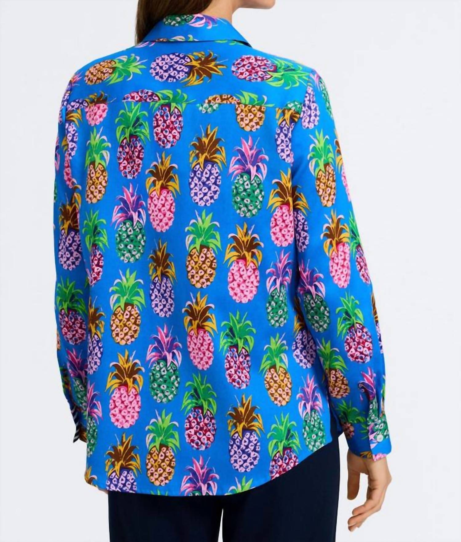 This button down shirt is comfortable yet polished. Elevate your vacation wardrobe with the Zoey Long Sleeve Shirt by Foxcroft, a standout piece in a vibrant pineapple hue. Designed for the maximalist trend, this button-down shirt features a graphic pattern and a classic collar. Made from high-quality cotton, it ensures comfort throughout the summer season. Closure: Button closure. Care: Machine wash, tumble dry.