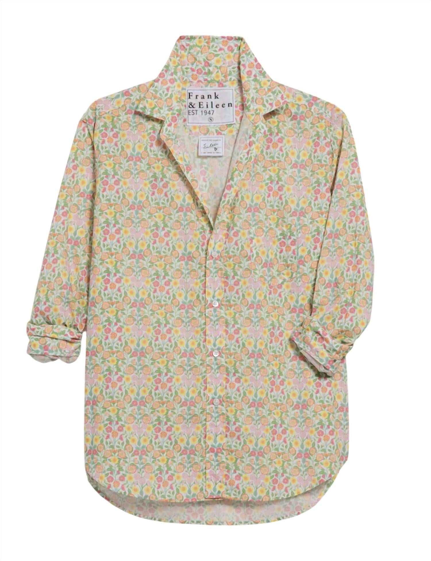 Meet the Relaxed Button-up Shirt by Frank & Eileen, crafted from Tana Lawn™ 100% cotton in an eye-catching Pink Bird Floral pattern. This women's shirt features long sleeves with button cuffs, signature bust-flattering button placement, a chest pocket, and a shirttail hem long enough to cover your bum. The collar neckline and circle-shaped design with soft rounded shoulders make it perfect for a Boho Chic look at holiday parties. Care: Turn inside out, machine wash cold, tumble dry low. Simone, at 5'8" with a 34" bust, models a size S.
