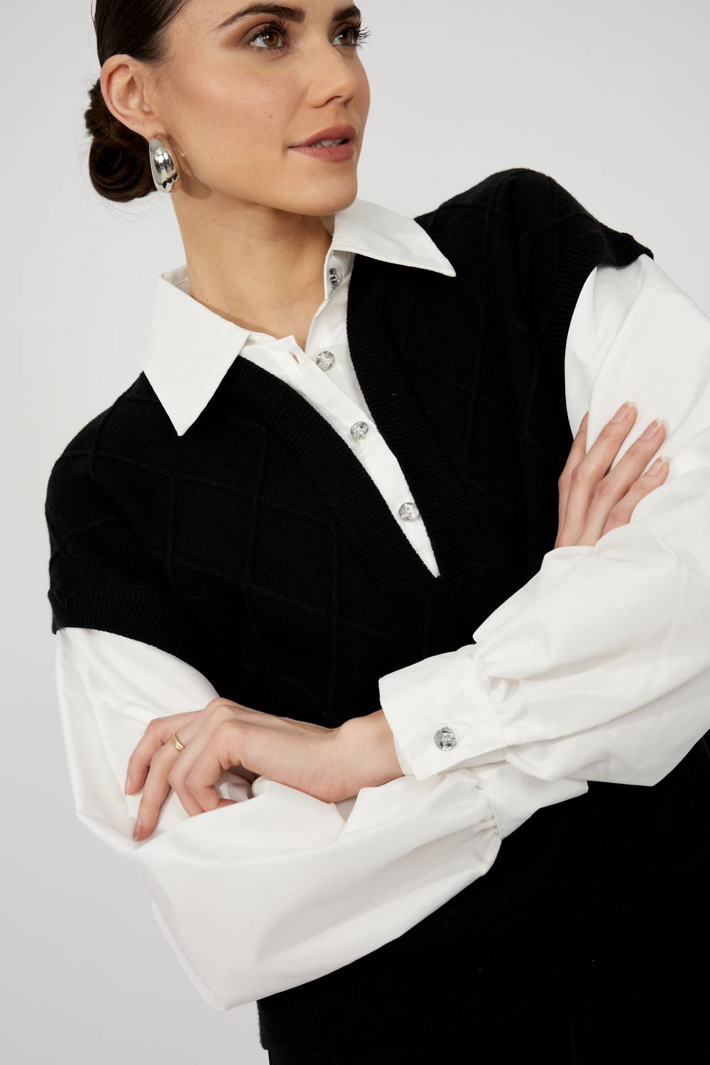 A classic button down shirt that will never go out of style. Introducing the Frank Lyman V-neck Diamond Puff Sleeve Top, a masterpiece in black/off white for those who appreciate style and comfort. This women's piece features long puff sleeves and is composed of 50% Rayon, 30% Polyester, 20% Polyamide, offering a soft touch and relaxed fit. The garment boasts a hip-length cut with a sophisticated button closure, adorned with jewel embellishments in a chic diamond pattern. Crafted with attention to detail, it requires hand washing and should be laid flat to dry. Model is 5'9"/175 cm and wears a size 6, with an approximate length for size 12 at 26" (66 cm).