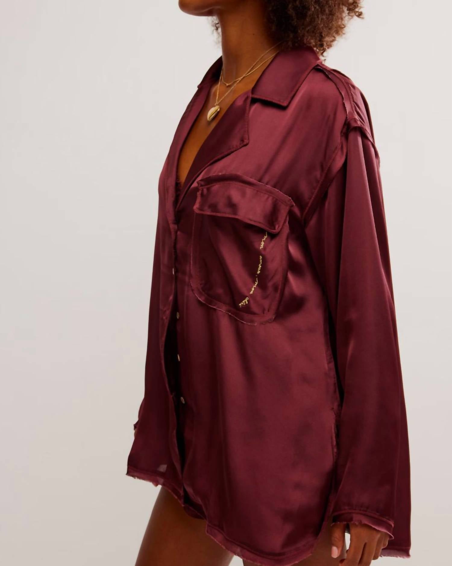 A classic button down shirt that will never go out of style. Elevate your vacation wardrobe with the Free People Like Honey Sleep Shirt in a captivating Açaí hue. Crafted from luxurious satin, this long-sleeve shirt offers a relaxed fit with a chic V-neckline and pleated detailing. It features a front button closure and a stylish breast tab pocket accentuated by raw trim and embroidery detail. Imported and perfect for summer outings, this piece is easy to maintain with machine wash care and line dry instructions, ensuring you stay effortlessly stylish through Valentine's Day and beyond.