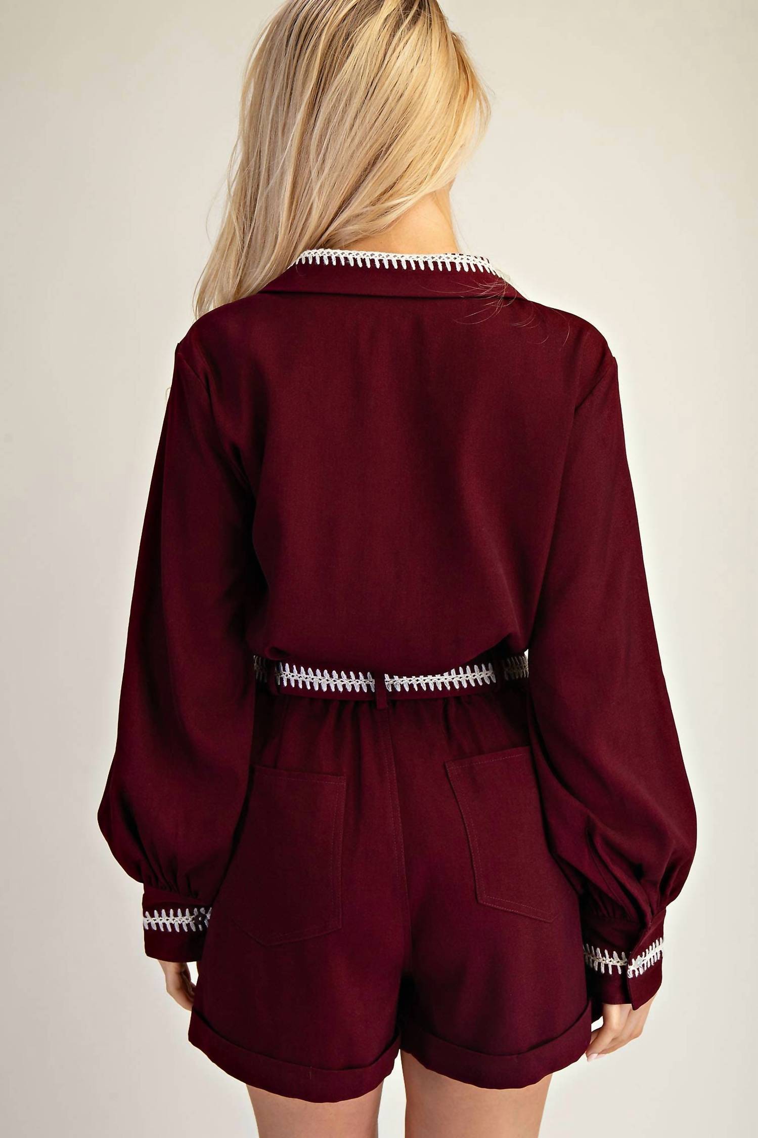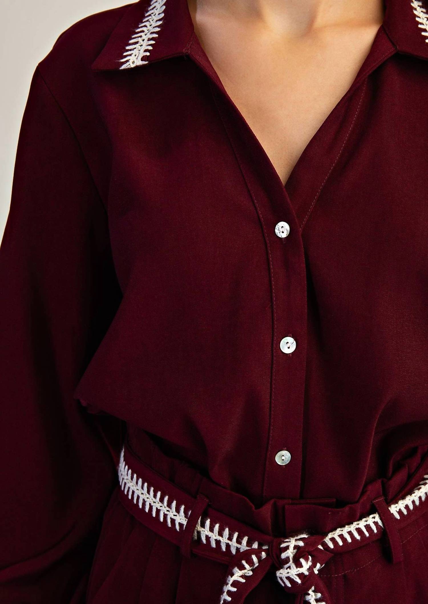 Elevate your wardrobe with the Stitched Grace Button-down Shirt by GLAM, designed to transition seamlessly from office to weekend. This versatile piece, available in burgundy and navy, features long sleeves with button cuffs and a chic V-neckline. Highlighting a subtle contrast stitch at the collar and cuffs, this shirt is crafted for a relaxed fit with a stylish shirttail hem, perfect for wherever the day takes you. Closure: Button closure. Care: Machine wash, line dry.