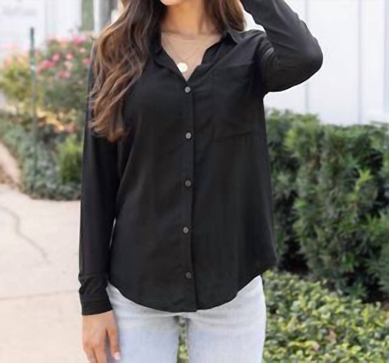 Perfectly tailored and soft to the touch. Meet your new wardrobe essential: the Stretch Fit Button Up by Grace and Lace, combining classic style with modern comfort. This women's button-up shirt in sleek black features long sleeves made from a soft, stretchy knit that ensures ease of movement. The front is crafted from woven ivory material for a sophisticated look, complete with functional buttons and a front pocket, along with a discreet inside button to prevent gaping at the chest. Originating from unknown sources, this solid pattern shirt does not have specific wash or dry instructions, ensuring ease of care with its tailored design.