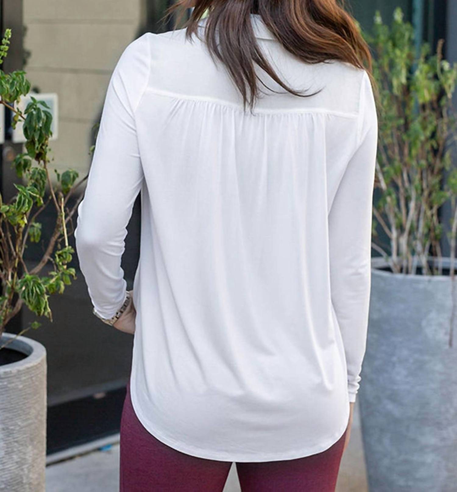 This button down shirt is comfortable yet polished. Introducing the Stretch Fit Button Up by Grace and Lace, a chic staple in ivory designed for both style and comfort. This women's top features long sleeves made from soft, stretchy knit, ensuring it moves with you. Crafted from rayon, it boasts a solid pattern with a functional front pocket and a collar neckline. Closure is a button closure, and care is easy with machine wash and lay flat to dry instructions.