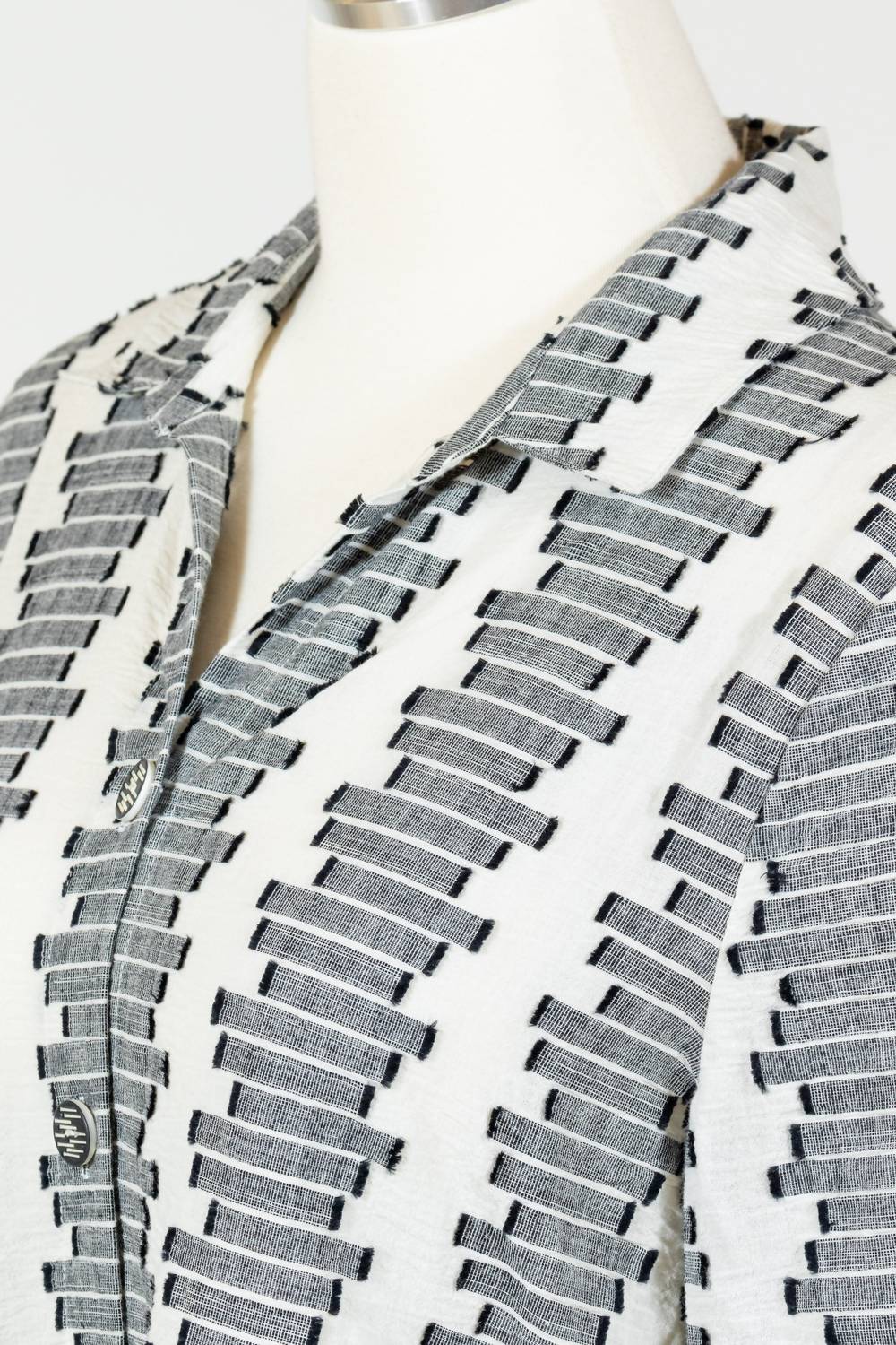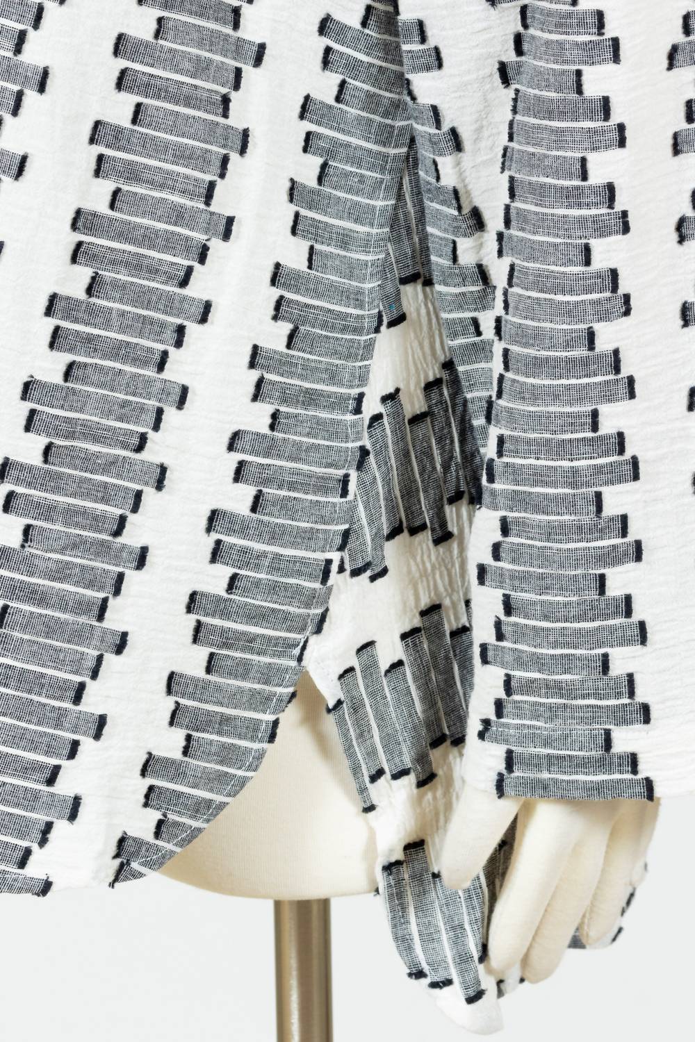 Perfectly tailored and soft to the touch. Introducing the Habitat Embroidered Wrap Around Shirt in Winter White, perfect for versatile styling this fall. This women's button down shirt features long sleeves, a relaxed fit, and a unique hand-sketched embroidered stripe pattern that adds a touch of minimalist elegance. Crafted from a 98% cotton and 2% spandex blend, it's designed with a rounded hi-lo hem and button closure for ease and comfort on your travels. Care is simple: just machine wash cold and tumble dry low to keep it looking its best.