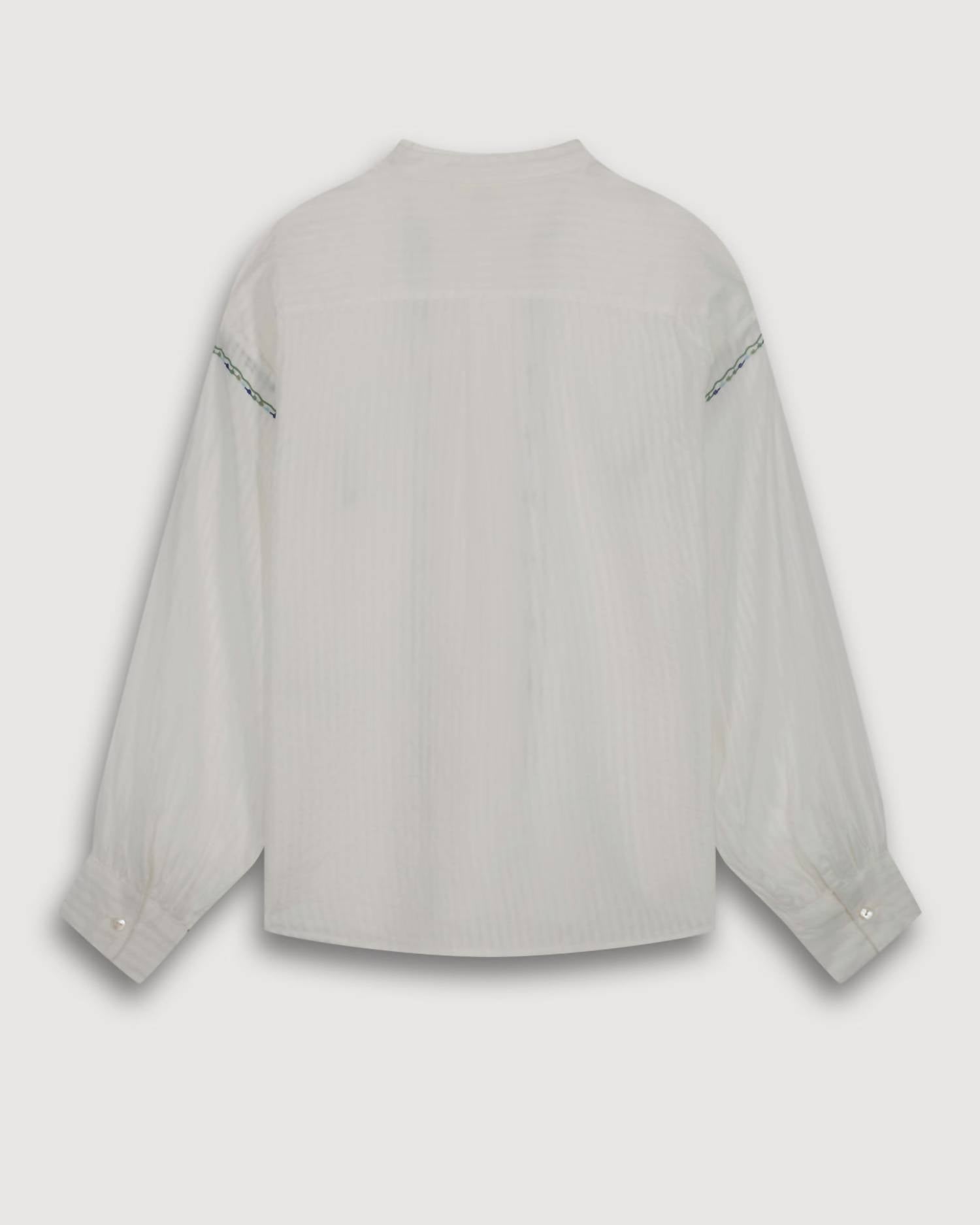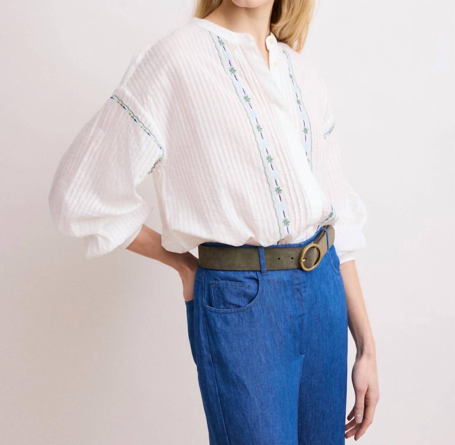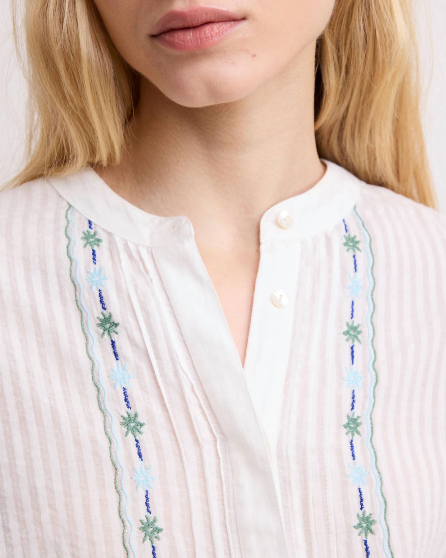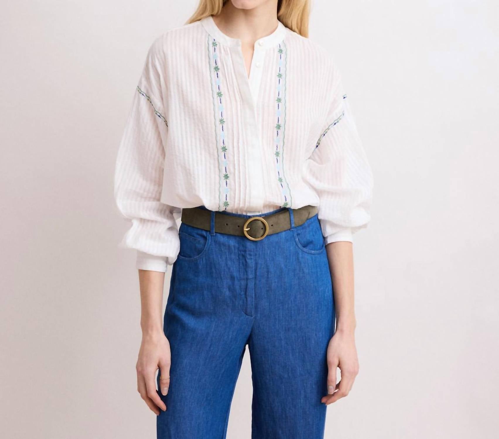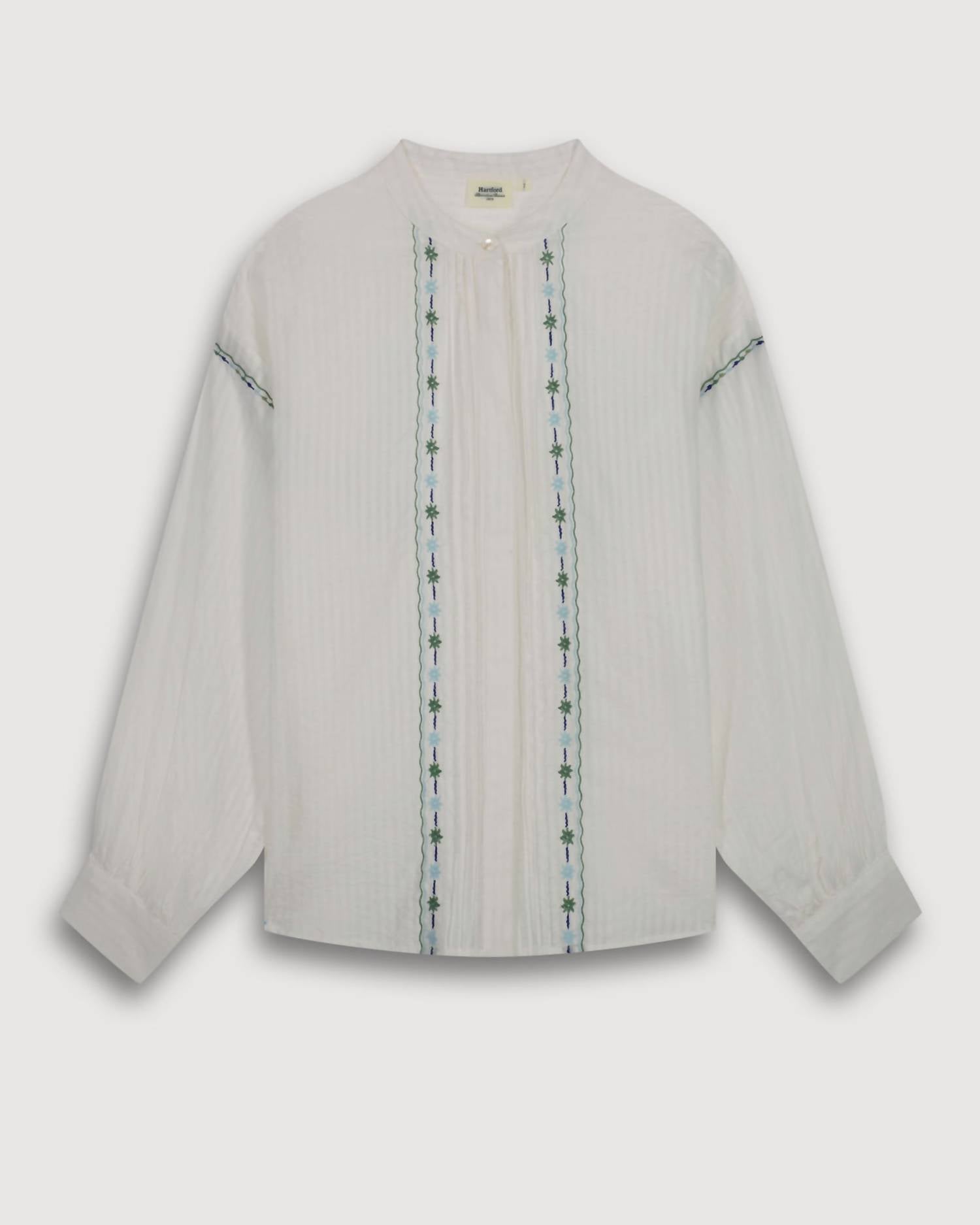Discover the Hartford Chile Shirt, an ecru button-down shirt crafted from Cotton Voile for a vintage-inspired spring look. This long sleeve women's top showcases colorful embroidery and pleat details on the front and armholes, complete with a hidden button placket adorned with mother-of-pearl buttons. Originating from India, it features a crewneck design and back pleats for added elegance. Perfect for holiday parties, this patterned shirt is a timeless addition to your wardrobe.