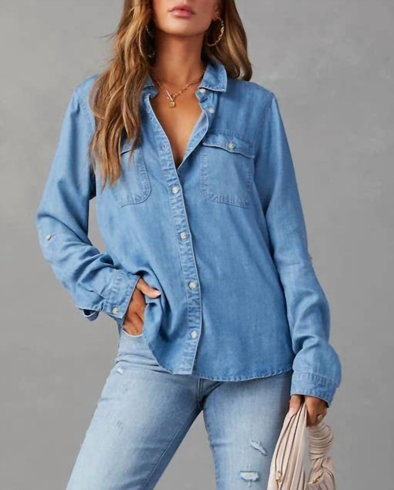 A classic button down shirt that will never go out of style. Meet the Lapel Single Breasted Denim Shirt by Hiddenbrand, a chic essential for your travel wardrobe in dark blue. Crafted from solid denim, this long sleeve shirt pairs perfectly with your favorite outfits for a touch of workwear elegance. It features a classic collar and a practical button closure, complete with handy pockets for added functionality. Care: Machine wash. Ideal for women embracing springtime adventures.