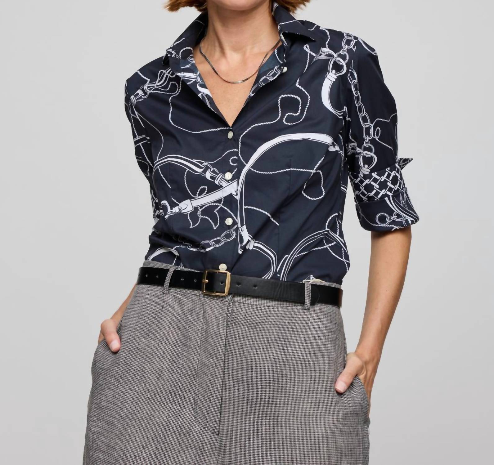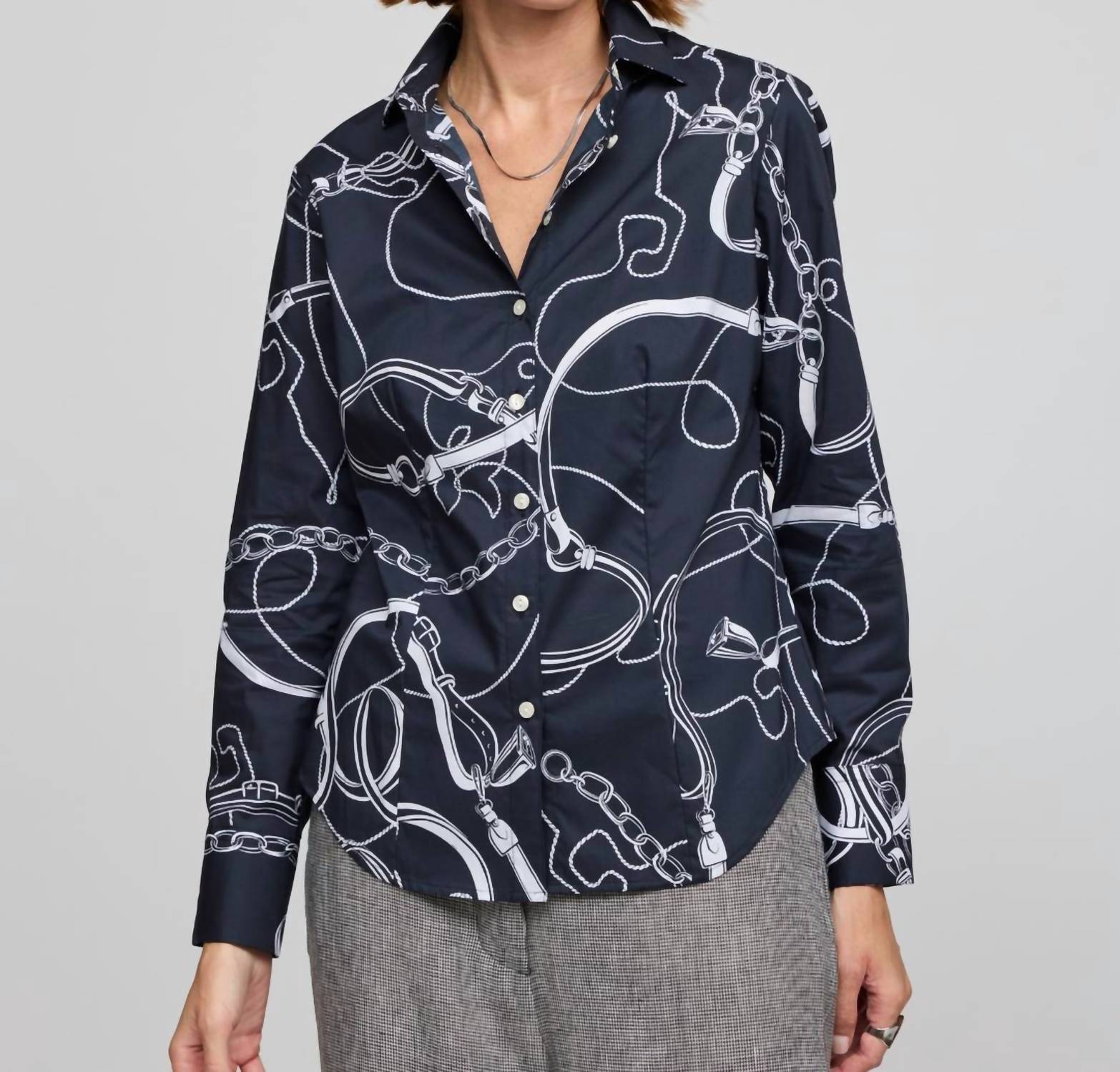 This button down shirt is comfortable yet polished. Introducing the Diane Long Sleeve Equestrian Print Shirt by Hinson Wu, where preppy style meets modern elegance. This women's shirt features a striking black and white graphic print, perfect for a holiday party or adding flair to your spring wardrobe. Crafted from a soft 96% Cotton/4% Spandex blend, it includes a classic collar and button closure for an effortlessly polished look. Care instructions: Machine wash and lay flat to dry.
