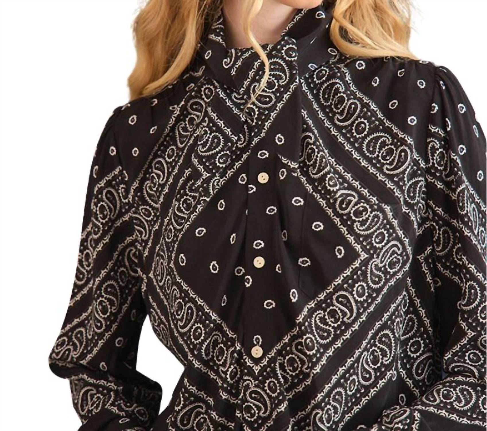 Perfectly tailored and soft to the touch. Introducing the Bandana Print Button Down Long Sleeve Top by Hunter Bell, a standout piece in Aces Wild Black for your fall wardrobe. Crafted from a viscose blend, this long sleeve shirt features a unique scarf detailed collar and measures 25" from the top of the shoulder. Closure: Button closure. Care: Machine wash cold with like colors, hang dry or dry clean.