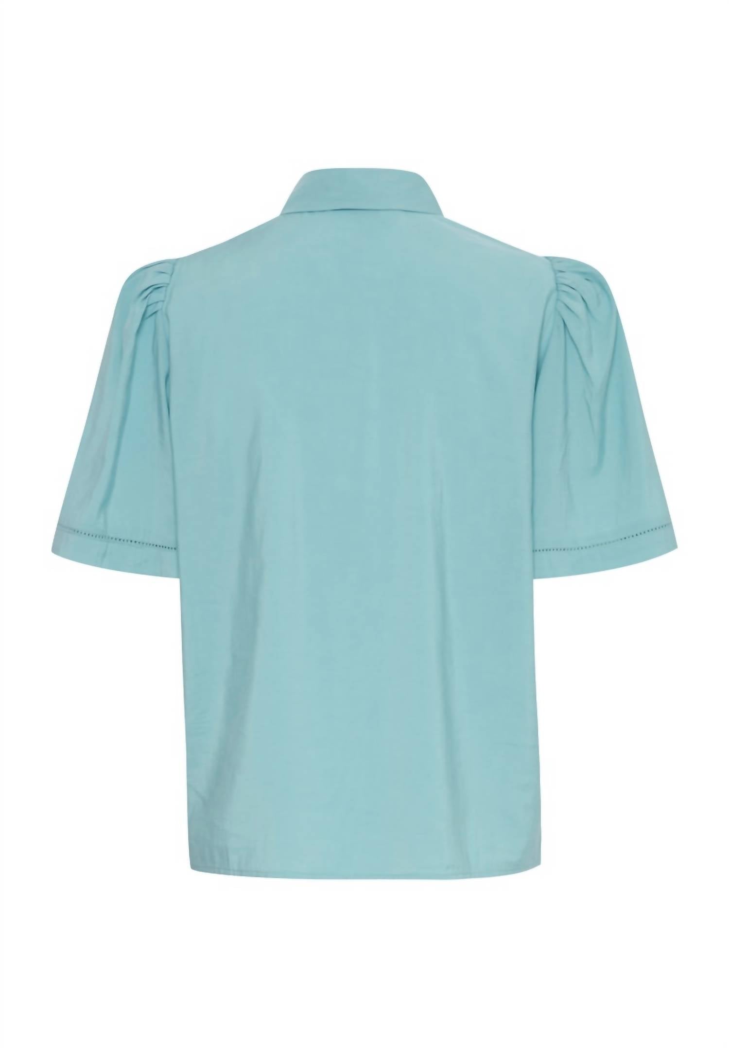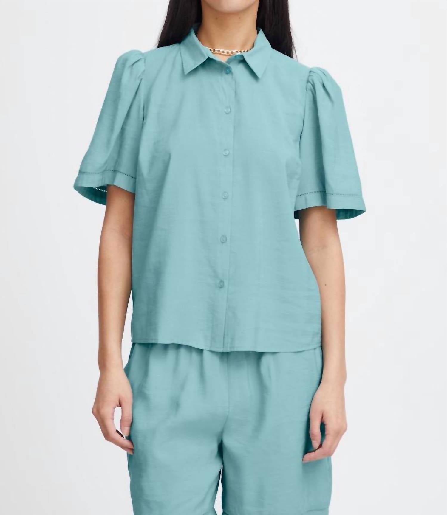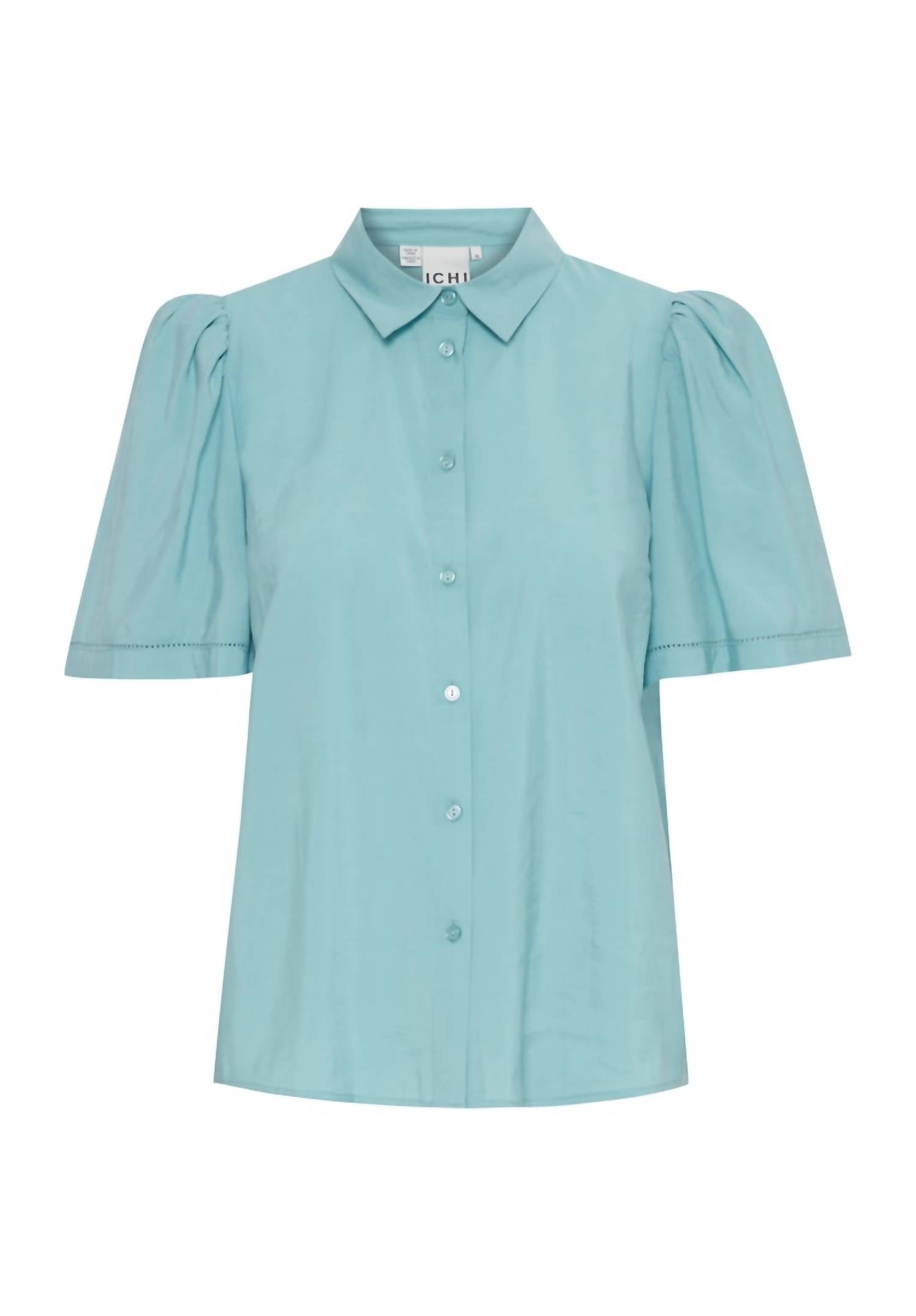 Introducing the Cinoma Shirt by ICHI, a classic Nile Blue button-down crafted for modern sophistication. This short sleeve shirt, with its solid pattern and collared neckline, is made from a smooth viscose blend for optimal comfort. Composition: 85% Viscose, 15% Polyester.