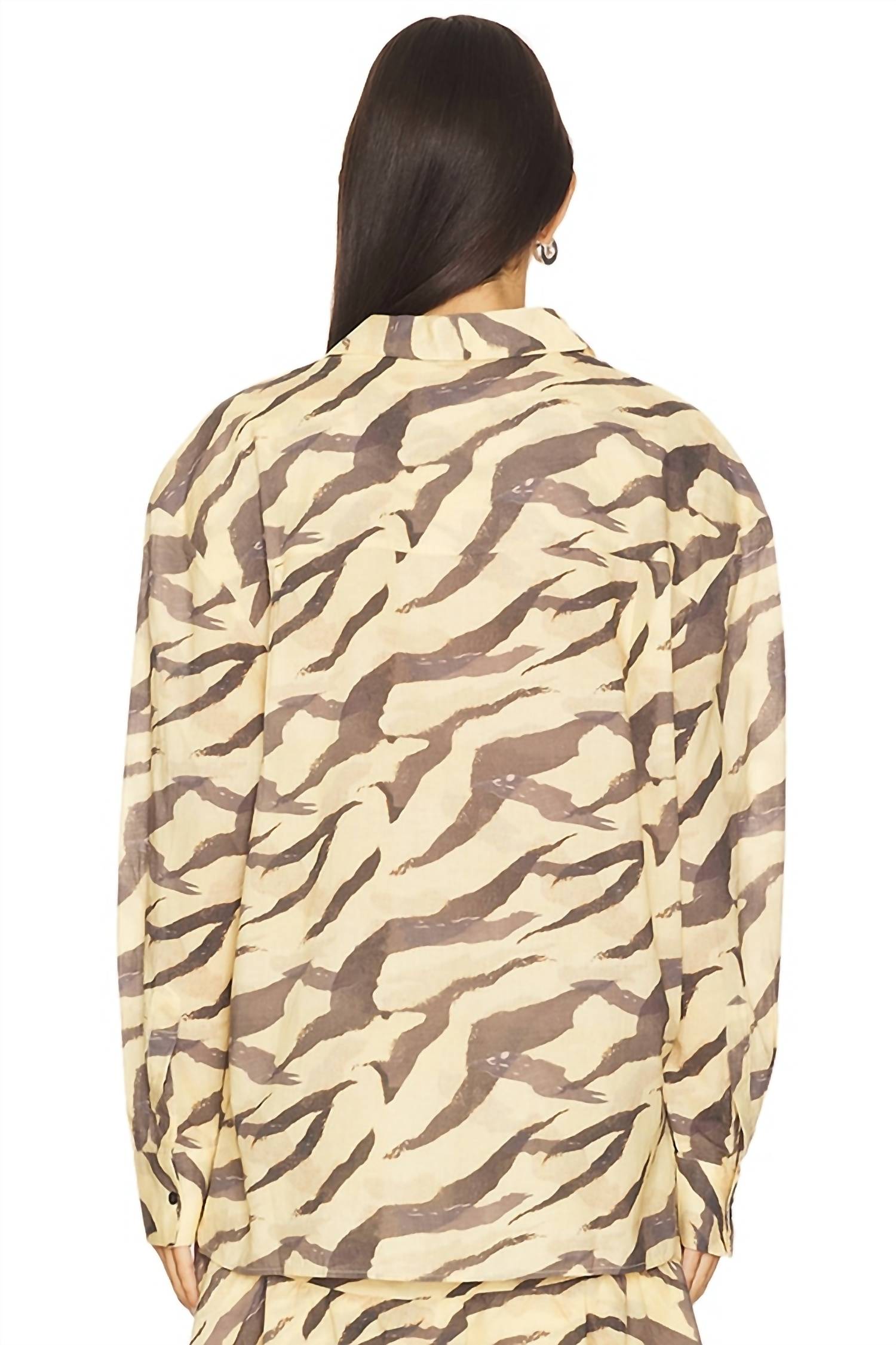 This button down shirt is comfortable yet polished. Experience the effortless charm of the IRO Deriana Button Up Shirt, featuring a striking tiger print that elevates any summer wardrobe. Crafted from 100% cotton, this long sleeve shirt offers the perfect balance of comfort and style with its medium-weight chiffon fabric. Equipped with a practical front button closure and a single chest pocket, this piece is made with precision in India. For easy maintenance, the shirt is machine washable, ensuring it remains a staple in your closet for boho-chic and vacation vibes.