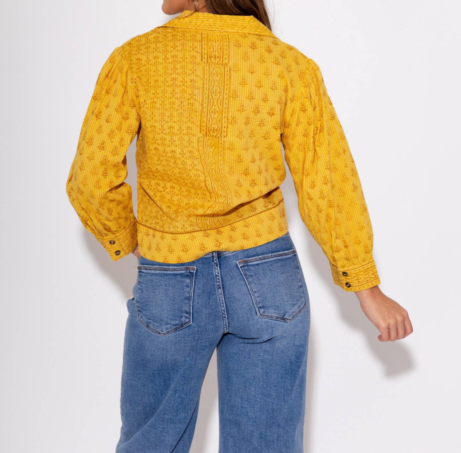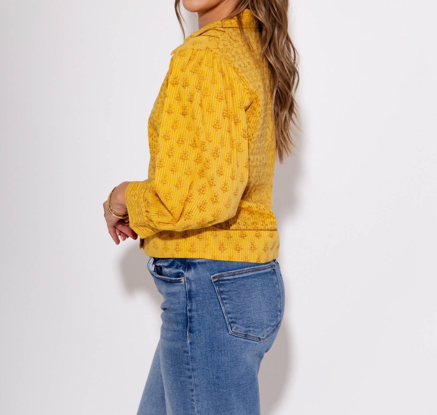 Perfectly tailored and soft to the touch. Introducing the Golden Hour Cropped Button Up by Ivy Jane, a glamorous addition to any wardrobe. This long sleeve shirt jacket in a striking yellow hue features a classic collar, enriched by an abstract floral pattern that adds texture and depth. Crafted with a button closure and designed with pockets, it offers a blend of style and functionality. Perfect for a holiday party or layering throughout the spring season, this versatile piece effortlessly complements both denim and dresses.