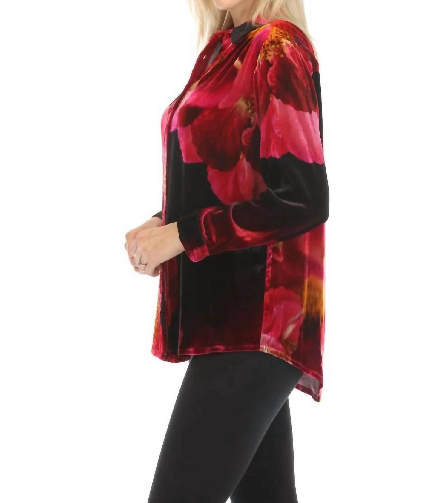 This button down shirt is comfortable yet polished. Introducing the Bloom Velvet Oversized Shirt by Johnny Was, crafted in a rich Ruby hue for the discerning woman. This button-down shirt boasts a luxurious velvet composition and features a maximalist-patterned design, perfect for a dinner party or any stylish occasion. The long sleeves with button cuffs and a classic point collar enhance its timeless appeal. Closure: Button closure. Please refer to the brand's care instructions for maintaining its pristine condition.