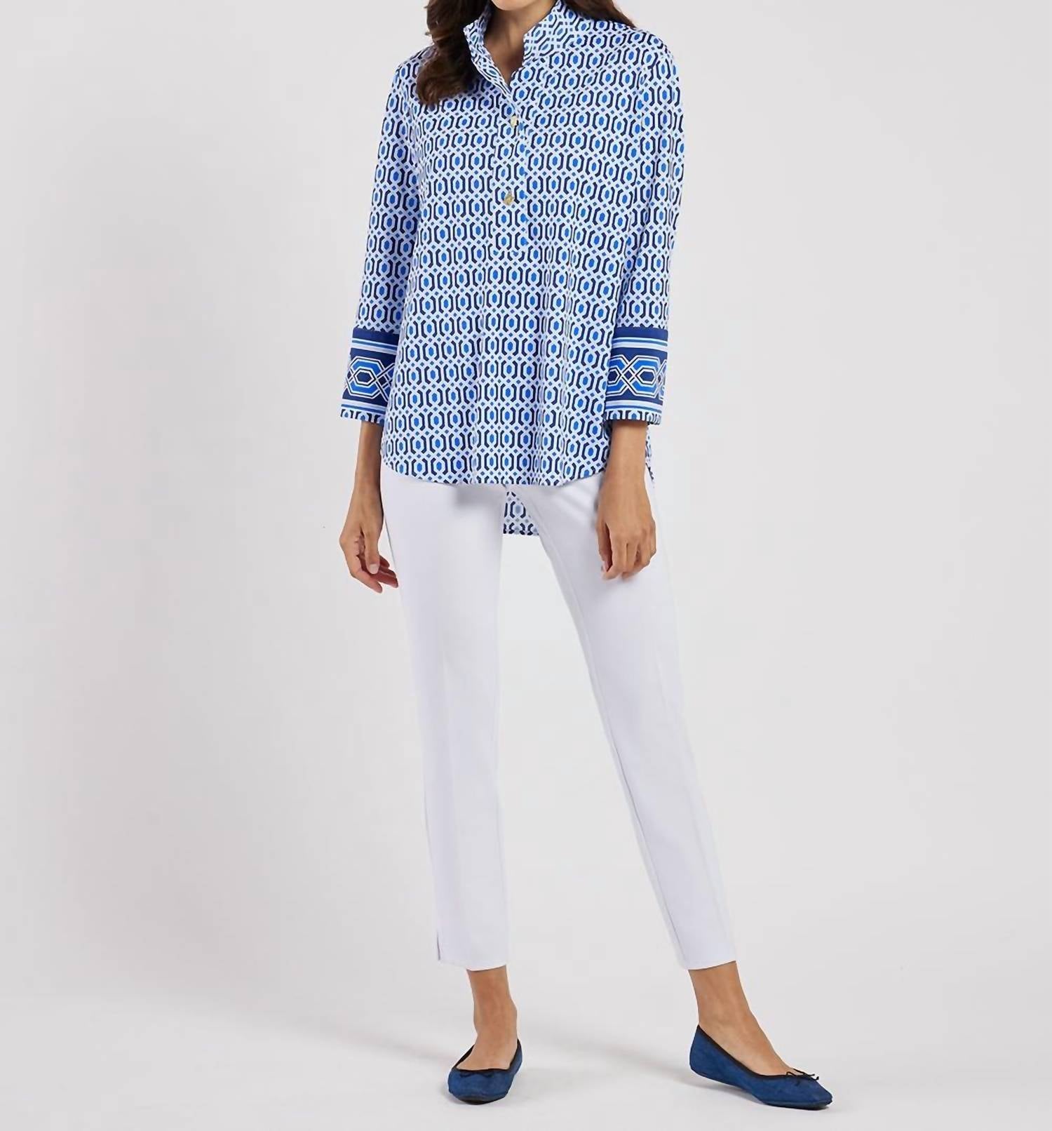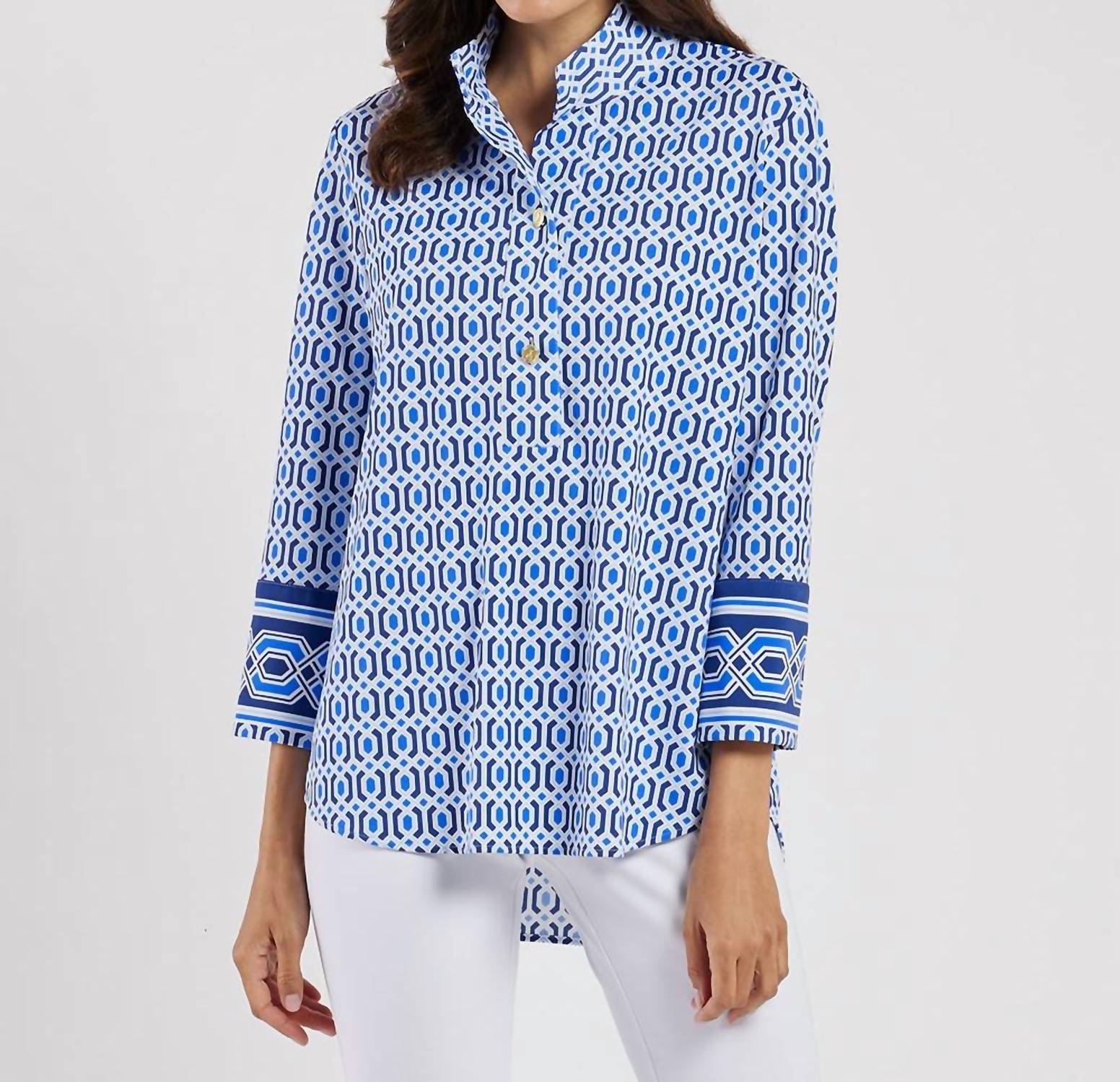 This button down shirt is comfortable yet polished. Discover the Belinda Top by JUDE CONNALLY, an elegant choice for any occasion. This pullover boasts three-quarter sleeves with a chic stand collar, adorned with signature gold JC buttons. Crafted from a nylon and spandex blend, it measures 28 1/2" from the top of the center back in a size small. Care is effortless with machine wash instructions and a cool iron if necessary. Model is 5'9" and wearing a size Small.