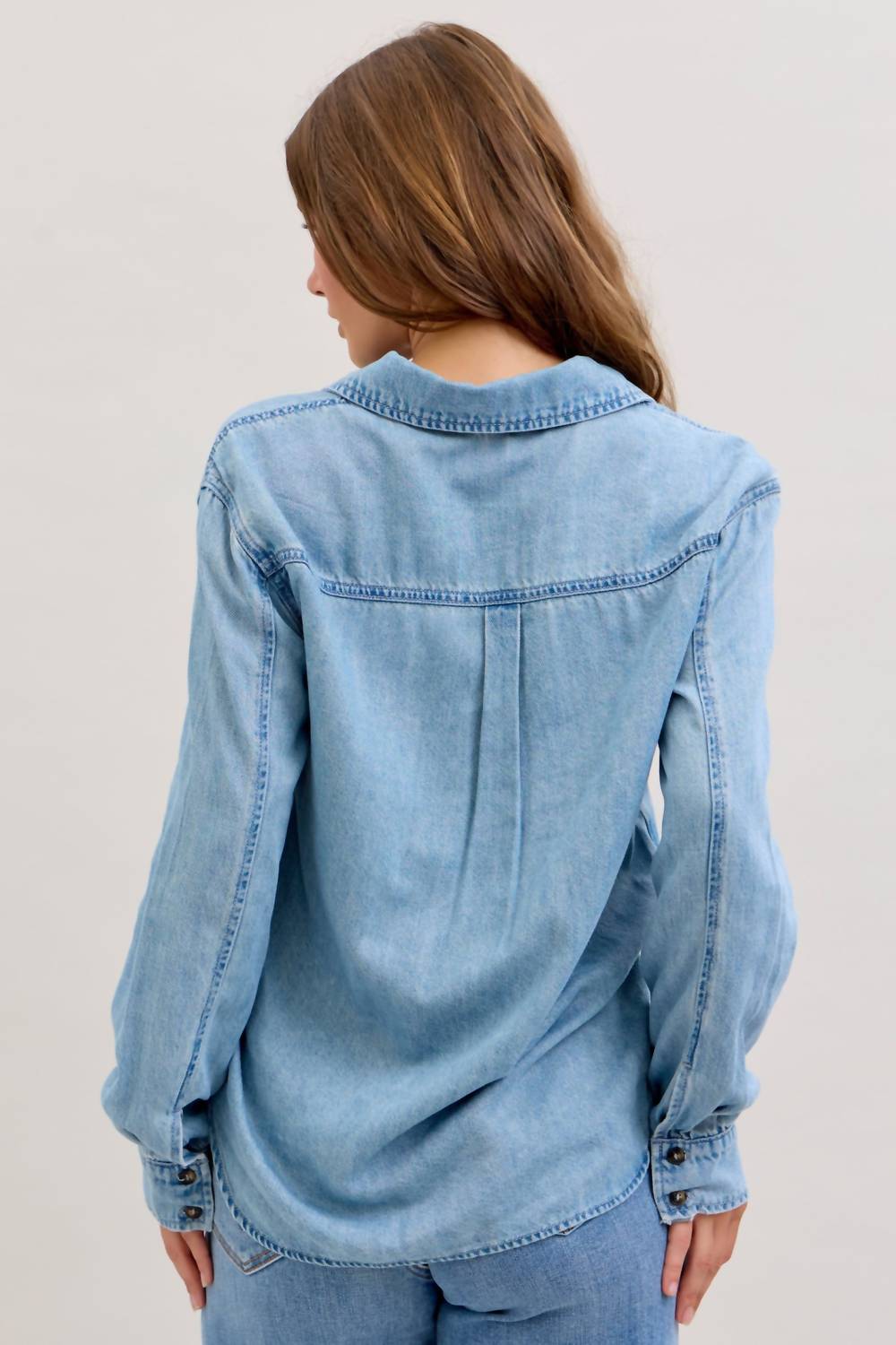 Perfectly tailored and soft to the touch. Embrace timeless style with the Judy Blue Denim Shirt, featuring long sleeves and a solid blue cotton blend crafted from 37% Cotton, 51% Lyocell, and 12% Hemp. This piece features a button closure and is available in a regular length of 26.25 inches, or plus 27.5 inches, ideal for a tailored fit. Perfect for layering, it boasts a western-inspired yoke design and a classic collar. Care is simple: machine wash turned inside out, then air dry or tumble low. Model 1 (size S): 5’9", waist 25.5", hips 38.5", bust 33.5". Model 2 (size 1XL): 5’10", waist 36", hips 50", bust 38".