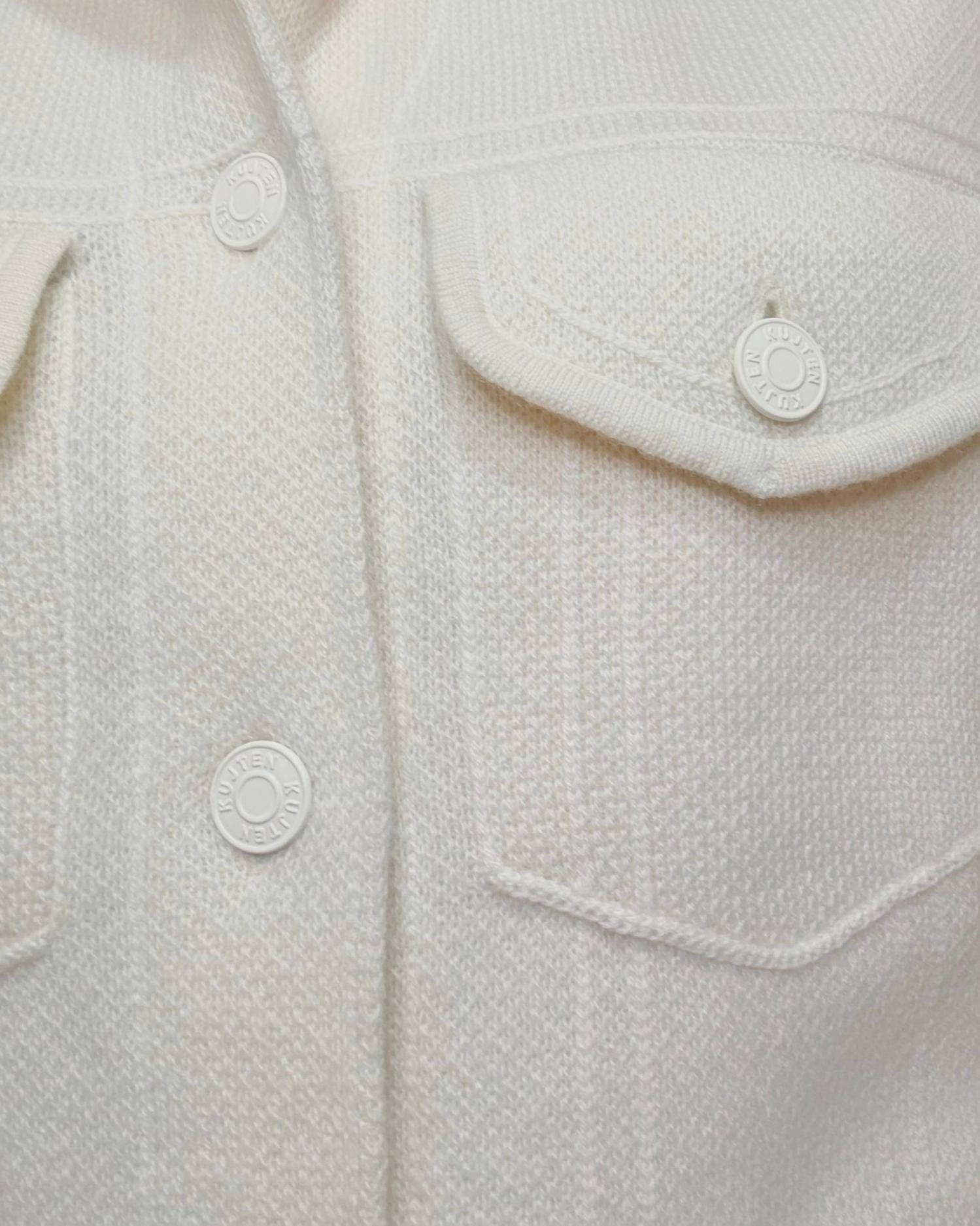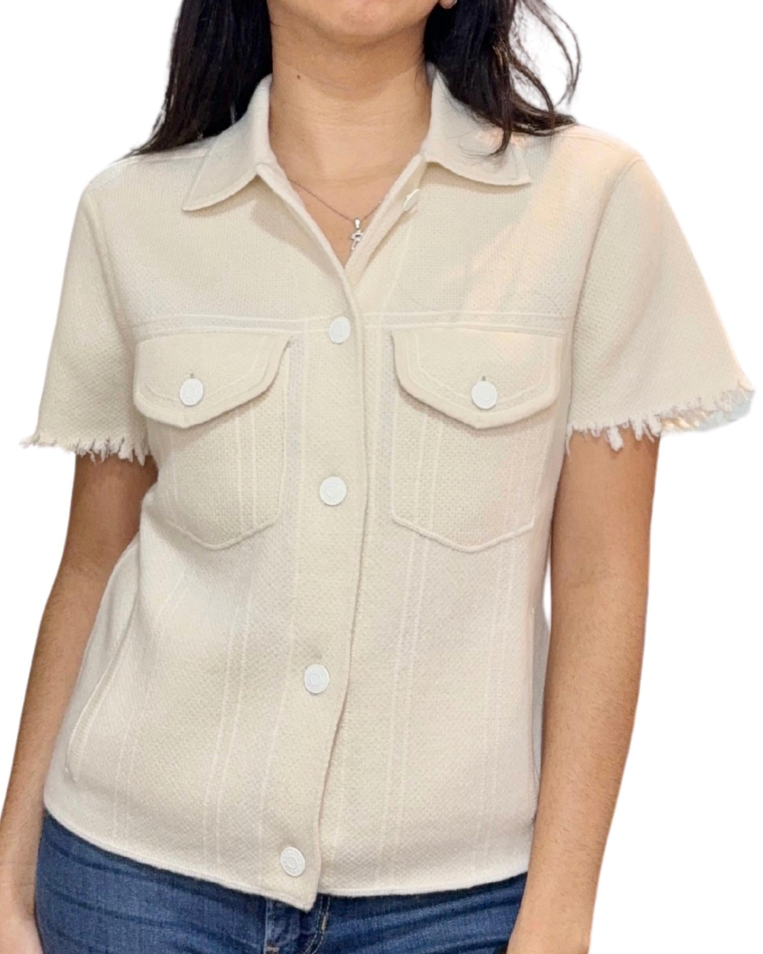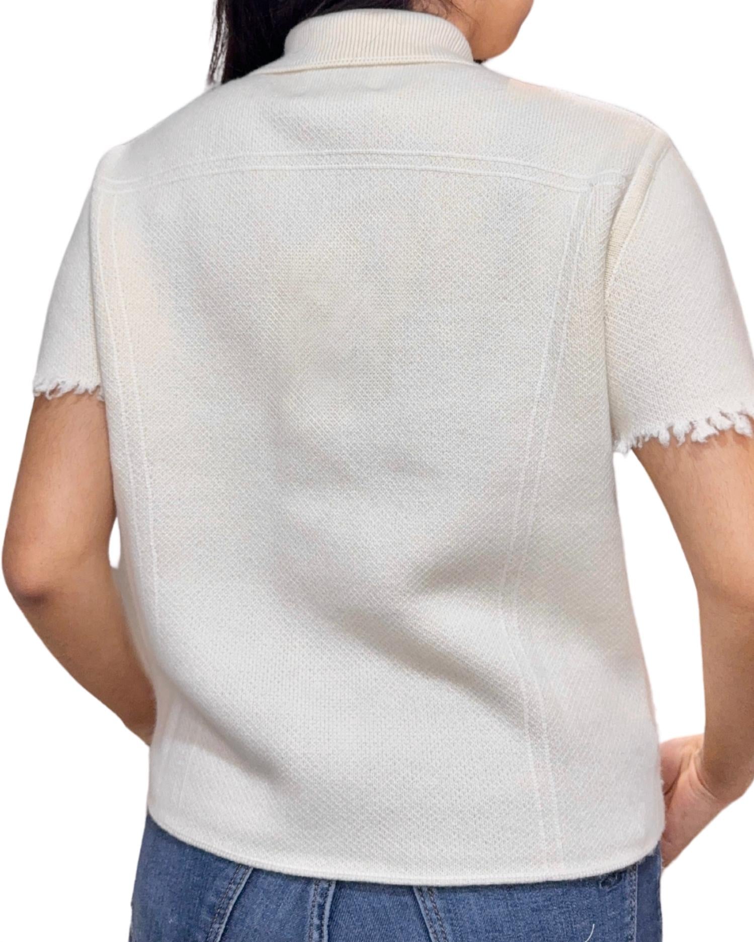 This button down shirt is comfortable yet polished. Introducing the Jessinda Destroy Shirt by Kujten, a chic addition to your wardrobe with a touch of rebellious elegance. Crafted from 100% luxurious cashmere, this short-sleeve shirt in stylish Blanc Vintage is tailored for women who appreciate minimalist trends. With a button closure and solid pattern, it offers a versatile, sophisticated look for a dinner party or any elegant occasion. Designed in Paris and expertly crafted in Inner Mongolia, this piece stands as a testament to refined craftsmanship and innovation.