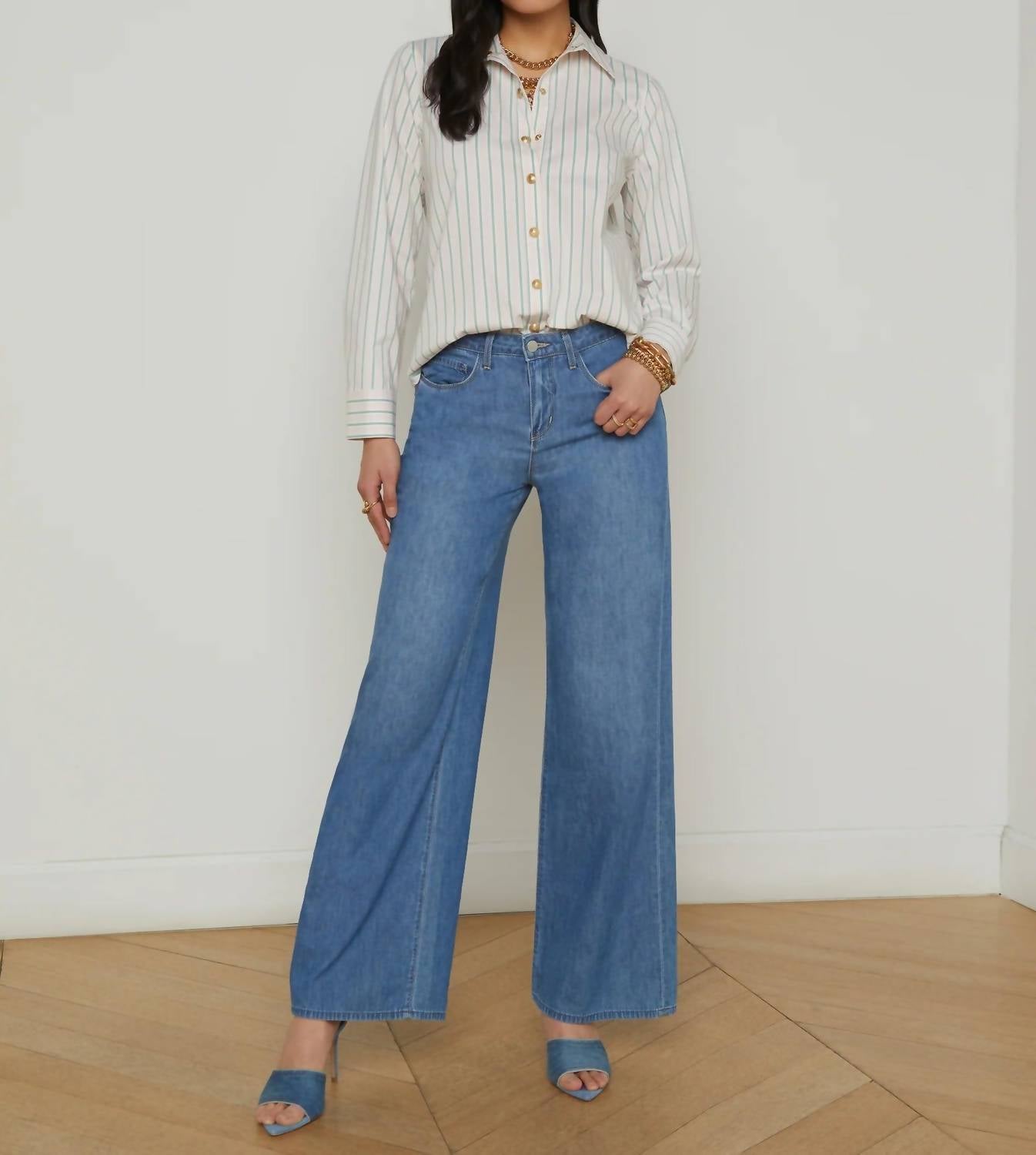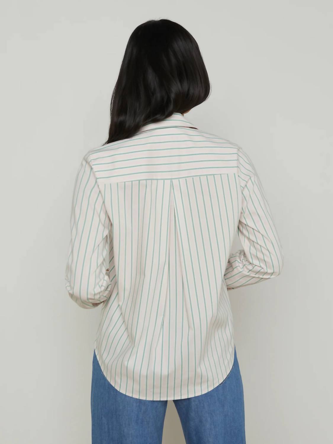 A classic button down shirt that will never go out of style. The Ellery Poplin Button-down Shirt by L'Agence is a chic update on the classic striped shirt, featuring a baby pink and sage stripe pattern. Crafted from stretch cotton poplin, it offers long sleeves and an easy relaxed fit for all-season wear. Its elegant design is highlighted by a pleated back yoke and embossed dome snap button closures. Perfect for a minimalist look at a holiday party, this shirt combines style with comfort effortlessly.