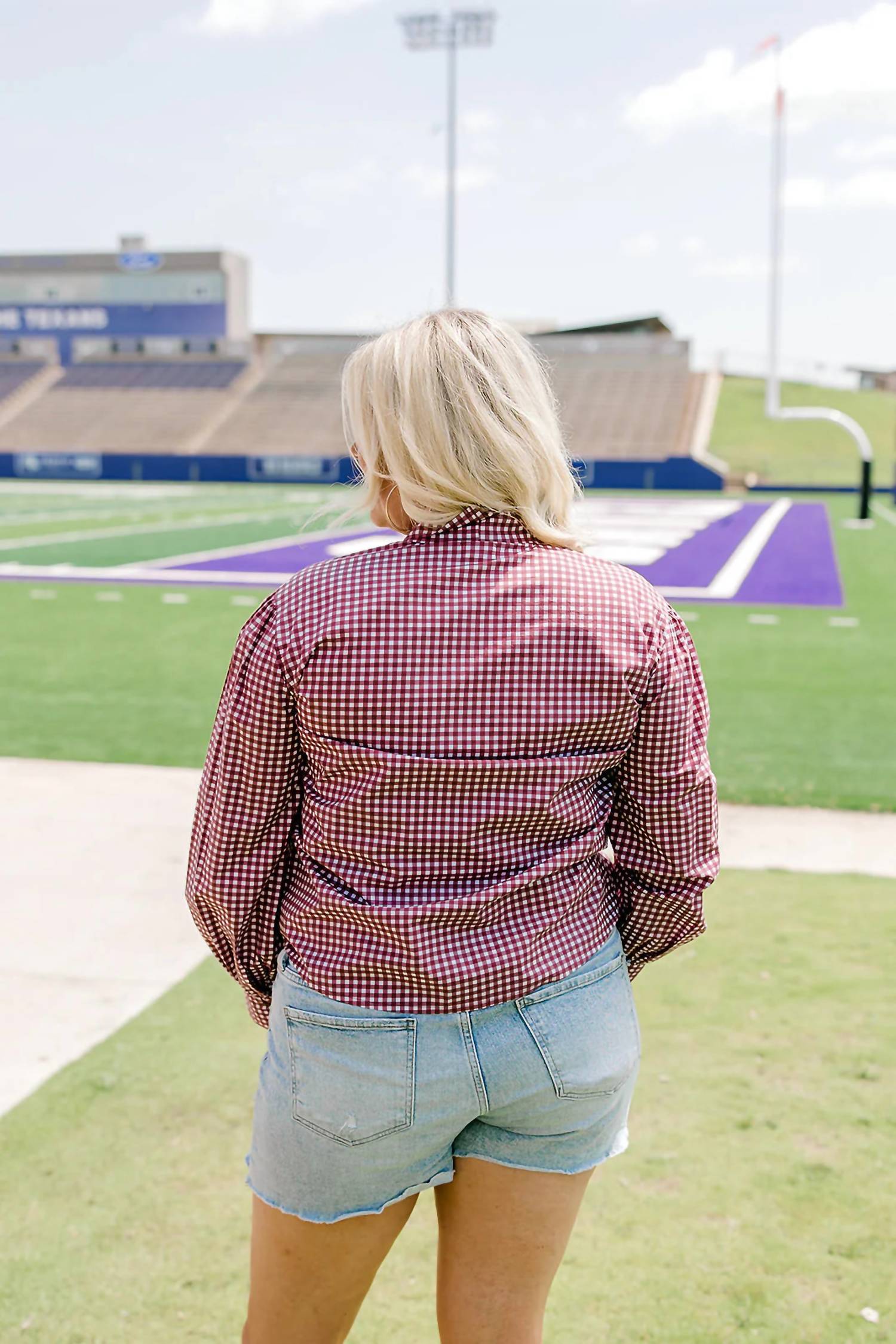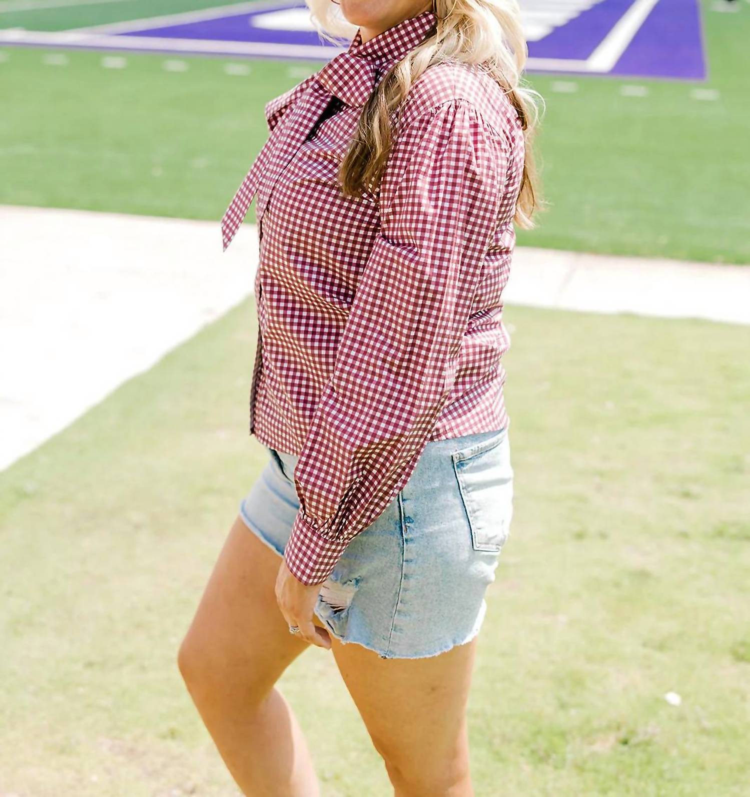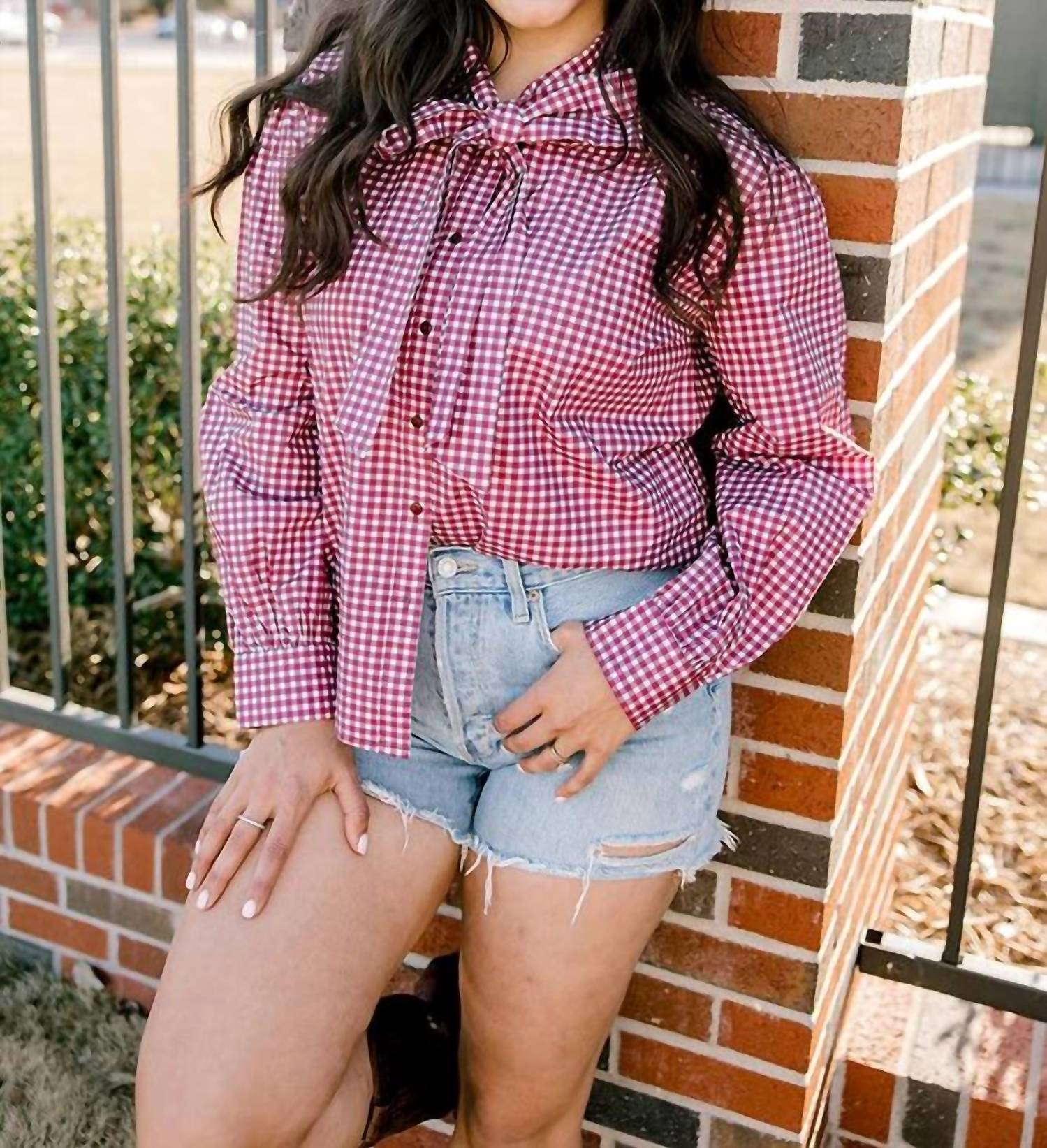 Elevate your wardrobe with the Sadie Gingham Top by Layerz Clothing, a stylish maroon and white gingham piece perfect for spring engagements and Valentine’s Day outings. Featuring a charming bow-tied collar, this long sleeve top is made from 100% cotton for comfort and breathability. Closure: Button closure. Care: Hand wash cold and line dry. Pair it with denim for an effortlessly chic look.