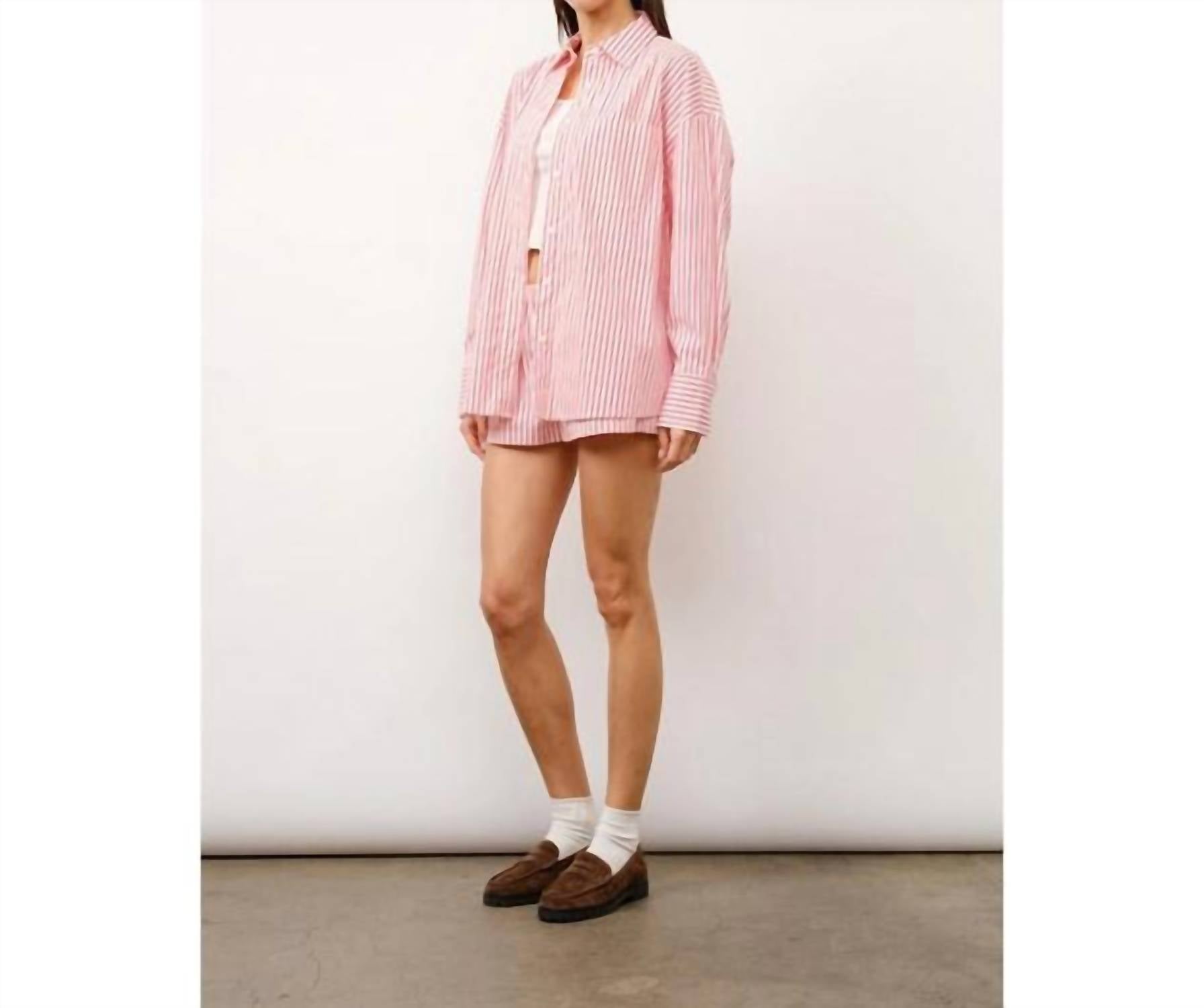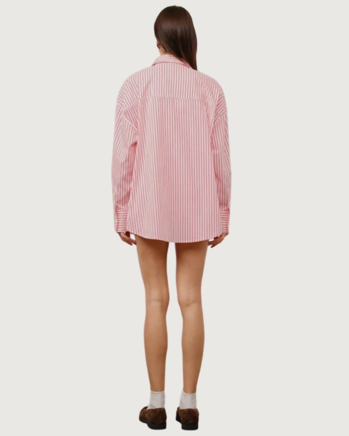 The Capri Striped Button Down Shirt by Loucia is an oversized piece designed for both comfort and style. Featuring long sleeves with button cuffs, this shirt is crafted from a durable cotton blend composed of 70% cotton, 27% nylon, and 3% spandex. It showcases a crisp poplin fabric with chic red and white stripes, complemented by a classic collar and a full button front closure. Ideal for a boho chic look during spring vacations or Thanksgiving gatherings.