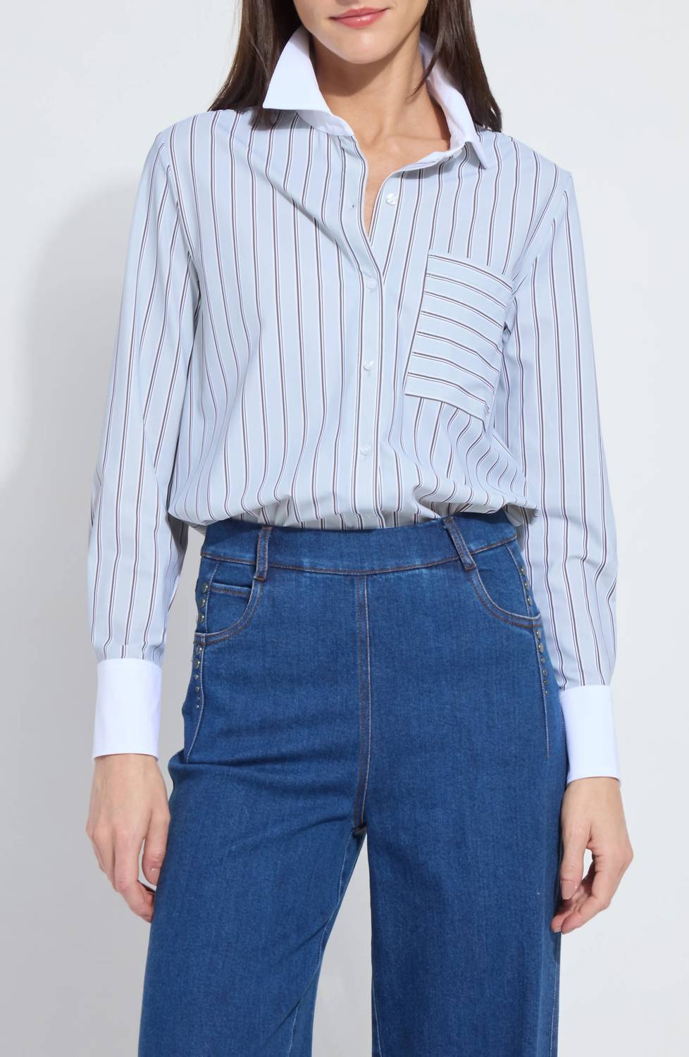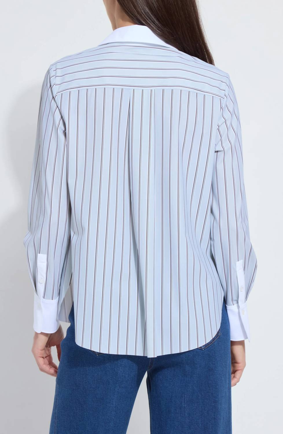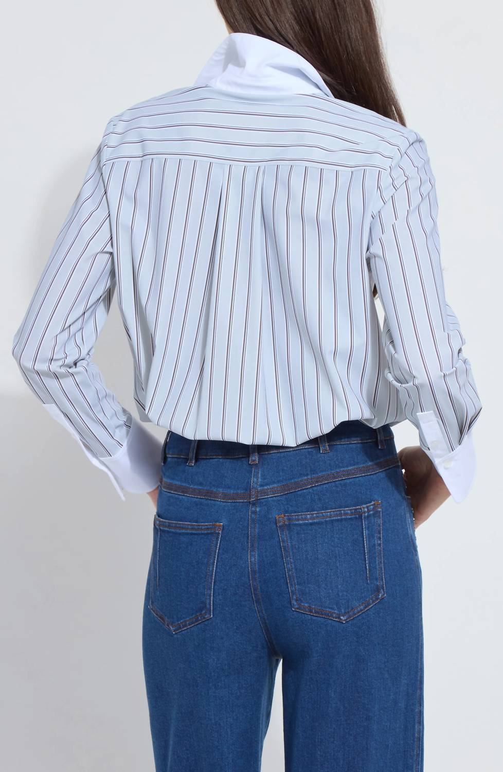A classic button down shirt that will never go out of style. Elevate your workwear wardrobe with the Lysse Stripe Crop Button Down Top, a sophisticated choice in white with a striped pattern. This women's top features long sleeves, a classic collar with contrasting details, and a front pocket, perfect for a polished look. Made from a nylon blend, it falls gracefully below the waist and secures with a button closure. Care for this stylish garment is easy with machine wash and line dry instructions.