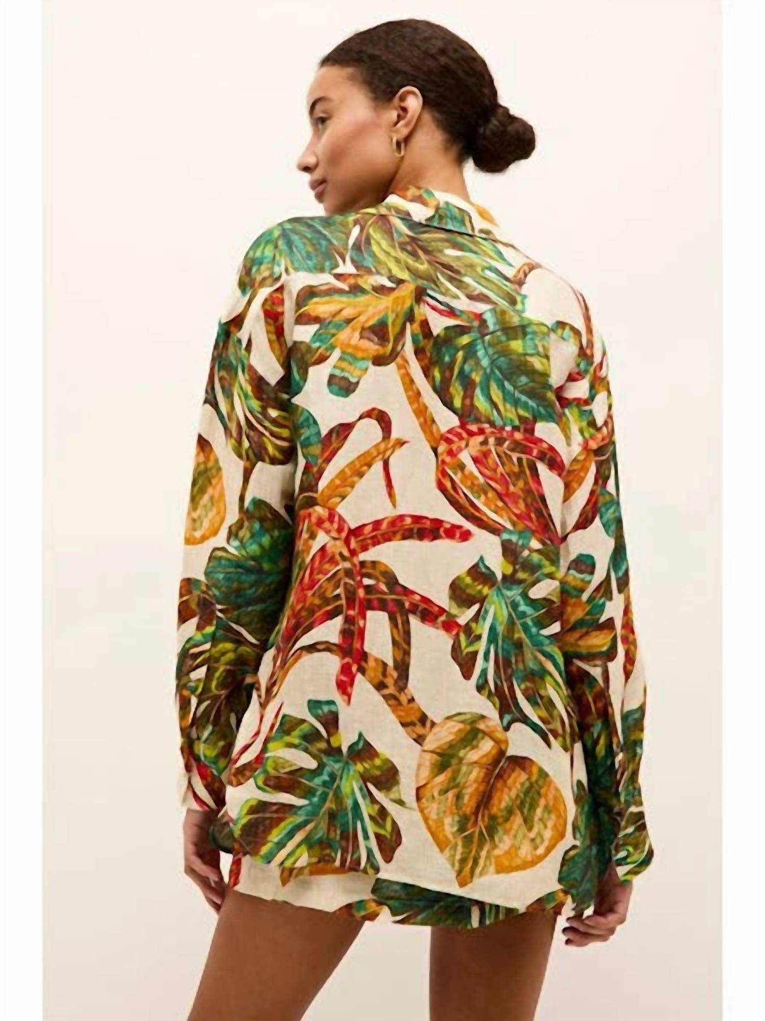 Perfectly tailored and soft to the touch. Embrace tropical vibes with the Nico Beach Shirt by Marie Oliver, offering a relaxed yet stylish silhouette in a vibrant jungle pattern. Designed for comfort with long sleeves, this shirt features a composition of 60% rayon, 20% linen, and 20% nylon. The button closure complements its casual, laid-back appeal, making it ideal for warm days and laid-back occasions. Care instructions recommend hand washing with a gentle detergent and line drying or opting for dry cleaning.
