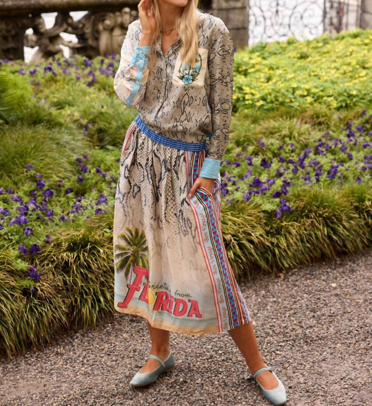 A classic button down shirt that will never go out of style. The Isabel Snake Print Shirt by Me369 combines bold design with classic style, perfect for making a statement. This eye-catching button-down features long sleeves with one adorned in vintage stamps and the other in sleek grey snakeskin, enhanced by a geometric collar and cuffs. Made from 100% Viscose, this shirt offers a touch of quiet luxury and is ideal for travel or New Year's Eve occasions. Care: Hand wash cold, lay flat to dry. Closure: Button closure. Complete with pockets and designed true to size.
