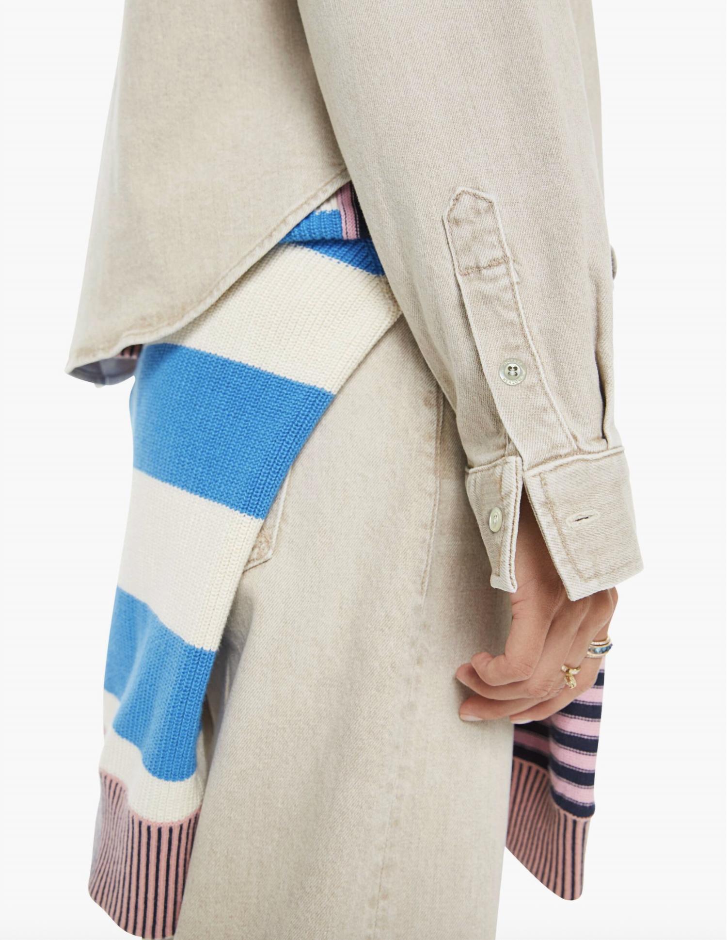 Perfectly tailored and soft to the touch. A button-up denim top with a front patch pocket and a curved, cropped hem. Made from semi-rigid SUPERIOR denim, Caramel is a faded khaki with tan stitching and shell-inspired buttons.