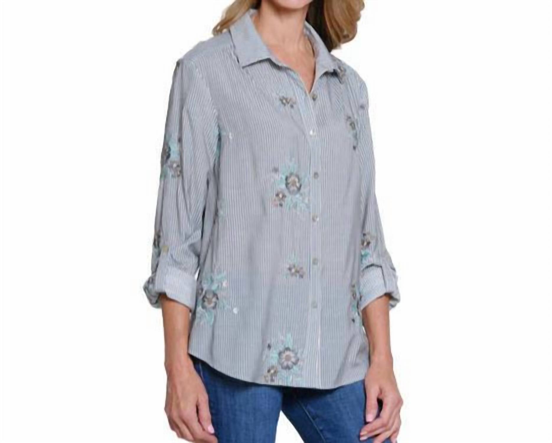 A classic button down shirt that will never go out of style. Introducing the Embroidered Button Front Shirt by Multiples, a playful yet polished piece in charming chambray. This shirt boasts long sleeves with a roll-tab feature and a classic button-front closure, enhancing its versatile appeal. Crafted from a breathable viscose-polyester blend, it features a soft slub crinkle texture complete with all-over embroidery and a hi-low hem for added flair.
