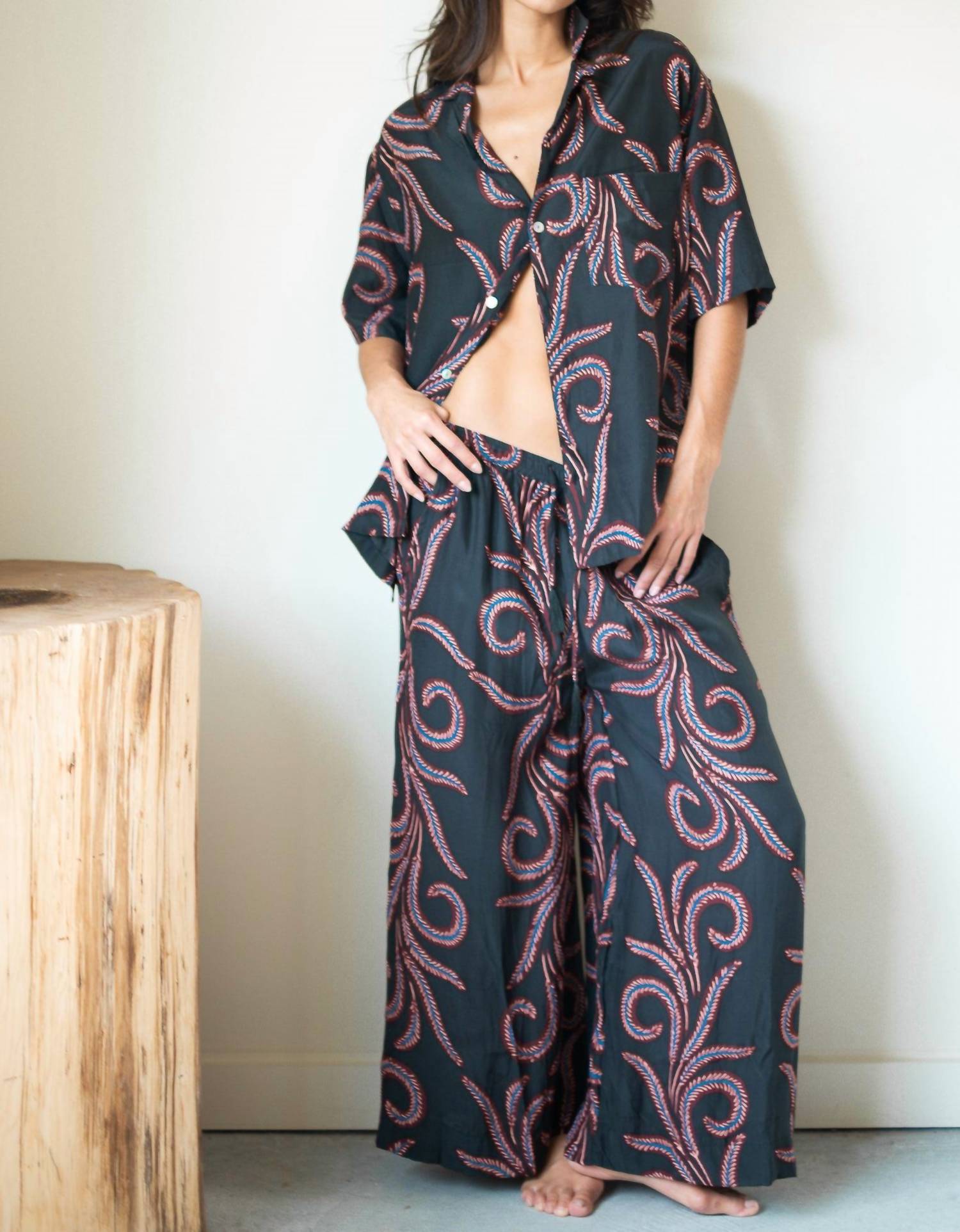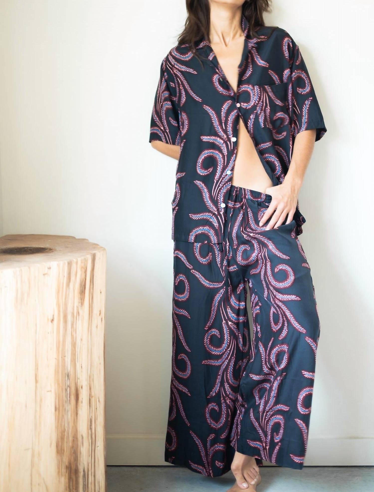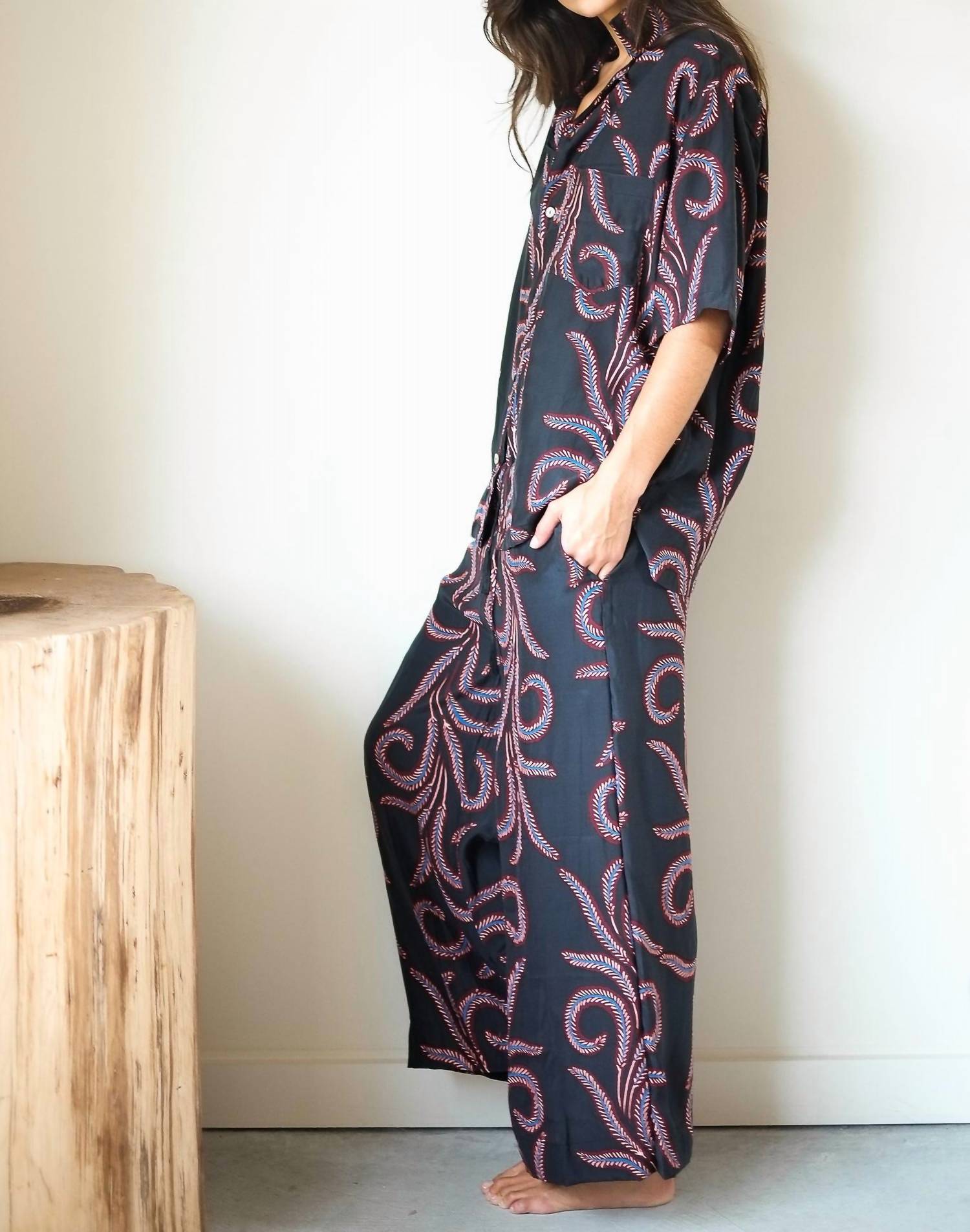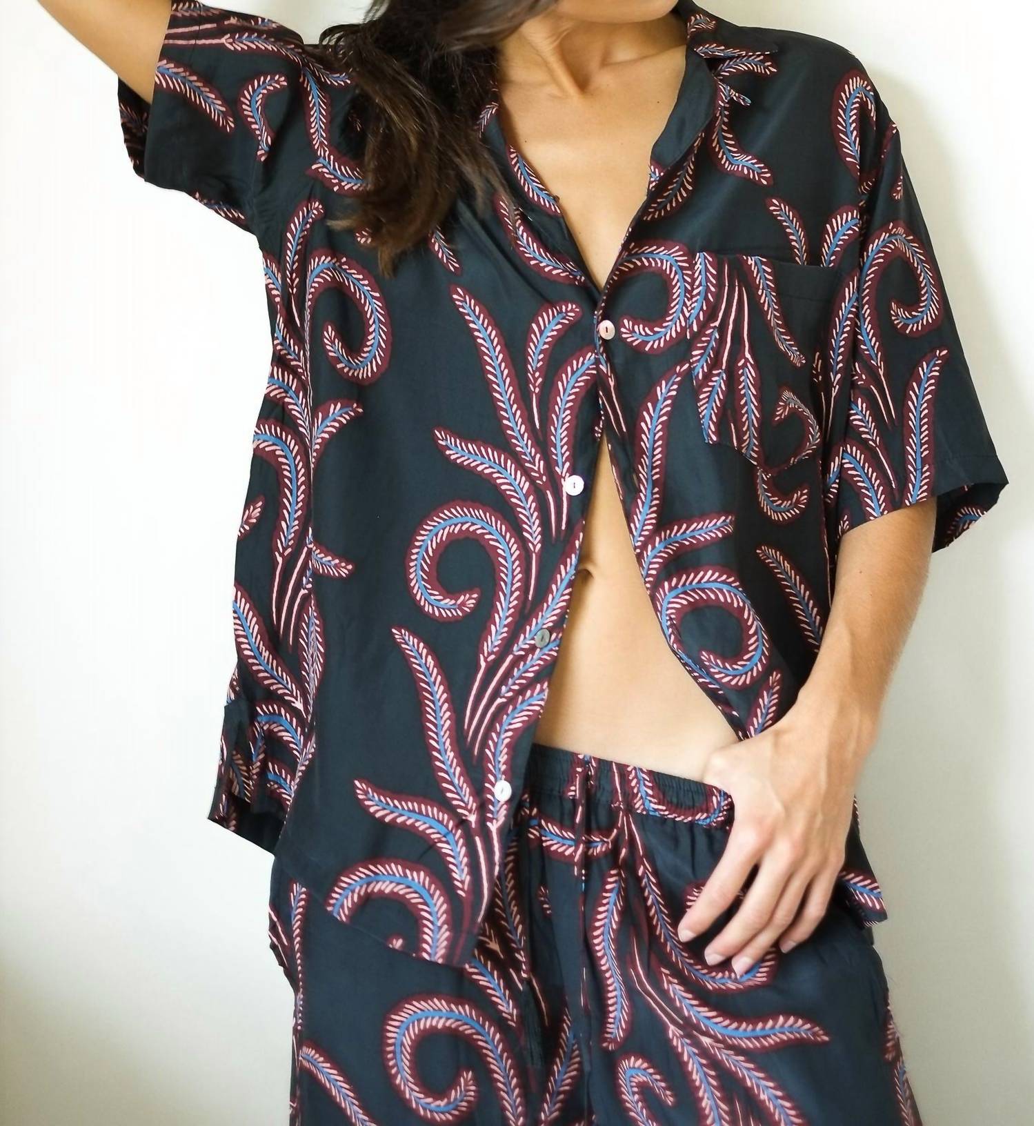 This button down shirt is comfortable yet polished. Introducing the Kevin Short-sleeve Shirt by Natalie Martin, a stylish addition to your closet with a feather black pattern. This shirt is crafted from 100% silk, offering a luxurious feel and features a pointed collar with a practical pocket detail. Designed with a classic short sleeve, it's perfect for a summer vacation or a 4th of July celebration with a boho chic flair. Closure: Button closure. Care: Machine wash.