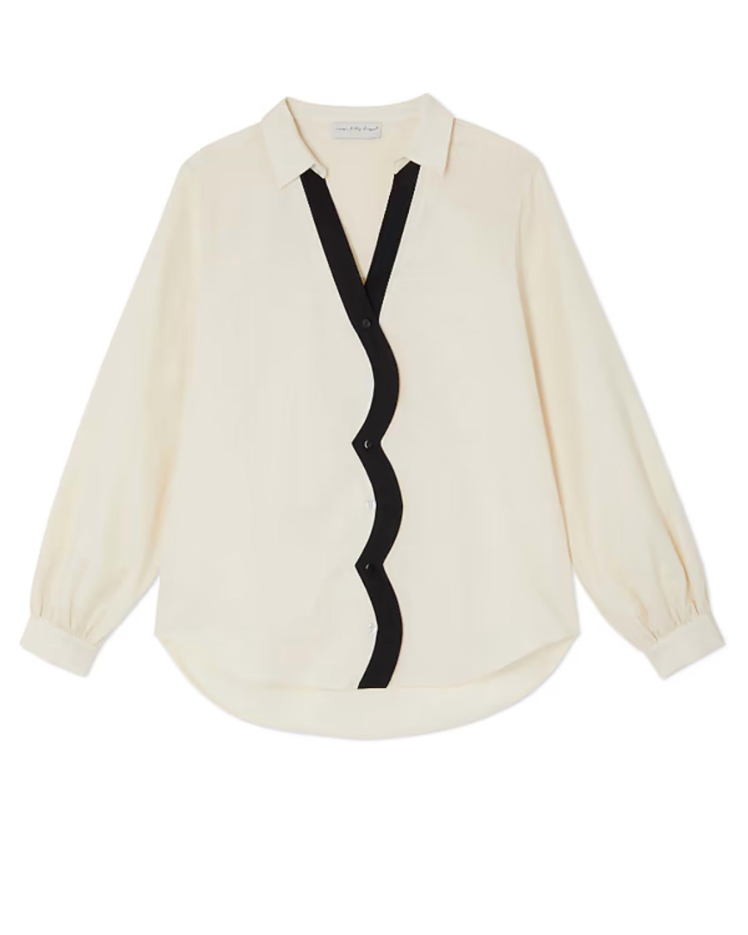 A classic button down shirt that will never go out of style. Meet the Mono Scallop Miley Shirt by Never Fully Dressed, a chic addition in an ivory color with a preppy, solid pattern. This shirt boasts long blouson-style sleeves and a classic collar neckline, enhanced by a scallop edge trim along the button stand. Closure: Button closure. Care: Hand wash. Perfect for elevating your wardrobe with its lightweight luxury, suitable for everyday wear.