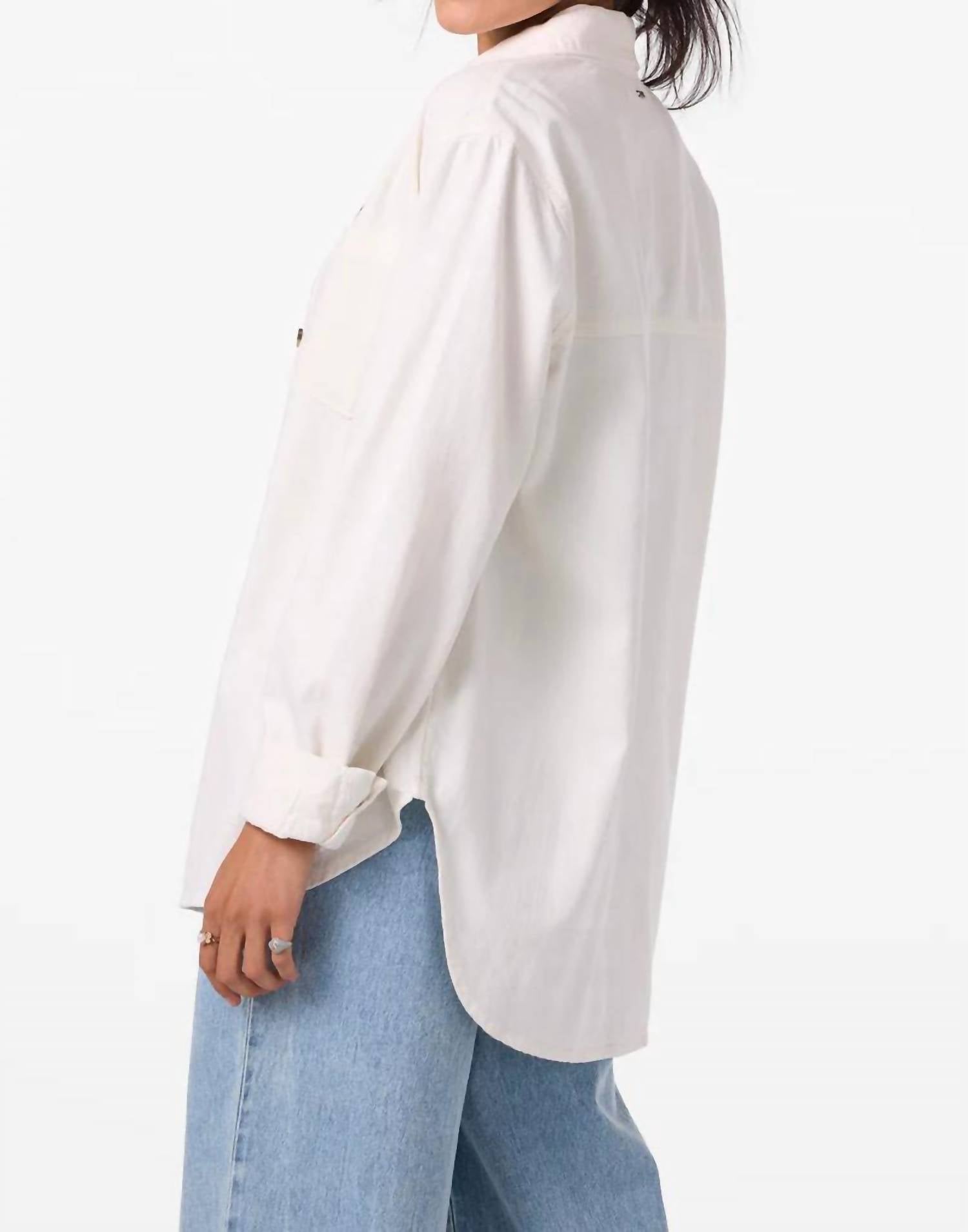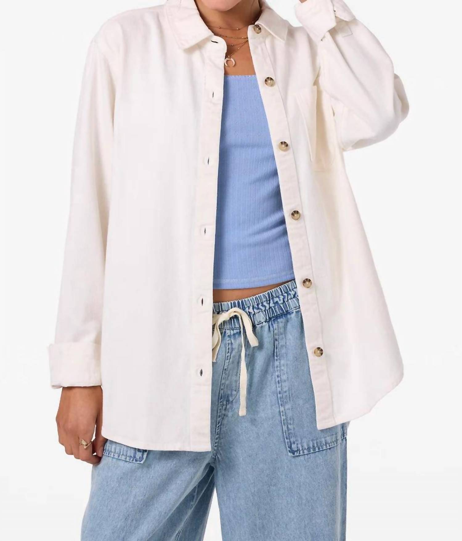 A classic button down shirt that will never go out of style. Introducing the Sevie Shacket by O'NEILL, a stylish and functional addition to your travel wardrobe in Winter White. This women's button-up shacket features long sleeves and a comfortable oversized fit with a raw edge hem detail. Crafted from 100% cotton twill, the shacket offers a heavier feel to keep you cozy, measuring 29.5" in length with a convenient front button closure and collar. Perfect for the minimalist trend this spring, it’s easy to care for with machine wash and tumble dry instructions.