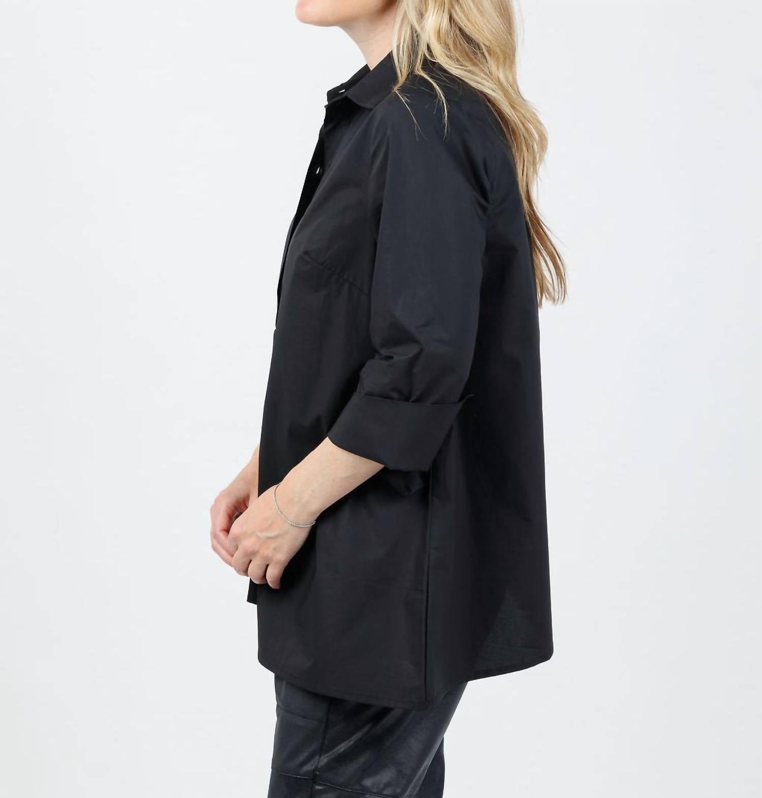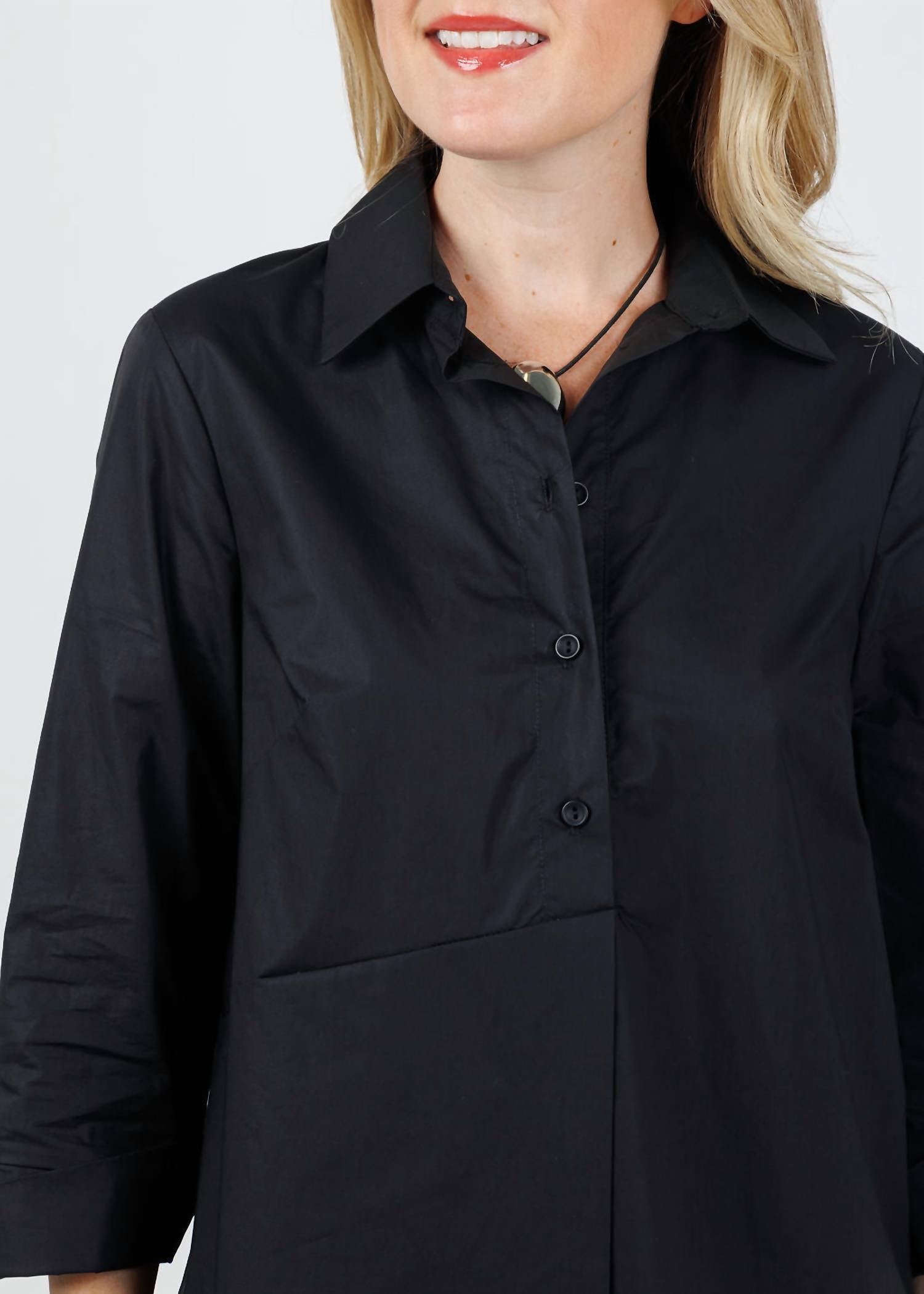 Perfectly tailored and soft to the touch. The Asymmetrical Button-down Shirt by Ozai N Ku in sleek black redefines elegance with a modern twist. Featuring three-quarter sleeves and crafted from 100% cotton, this piece offers comfort alongside style. It boasts a collared neckline and a half-button placket, while the asymmetrical hem adds an architectural edge. Closure: Button. Easy care with machine wash instructions.