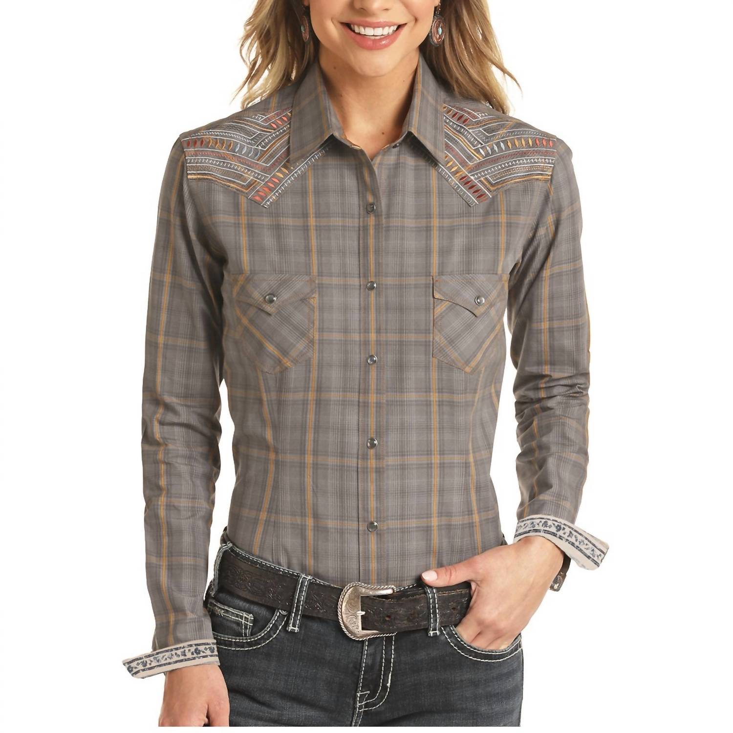 Discover the Dobby Plaid Snap Shirt by Panhandle, a perfect blend of Western flair and vacation vibe. Made from soft cotton in a timeless dark gray plaid and check pattern, this shirt features long sleeves for a classic look. Designed with practical pockets, it secures with a convenient snap closure and sports a smart collar neckline. The shirt is an ideal choice for those summer adventures in style.