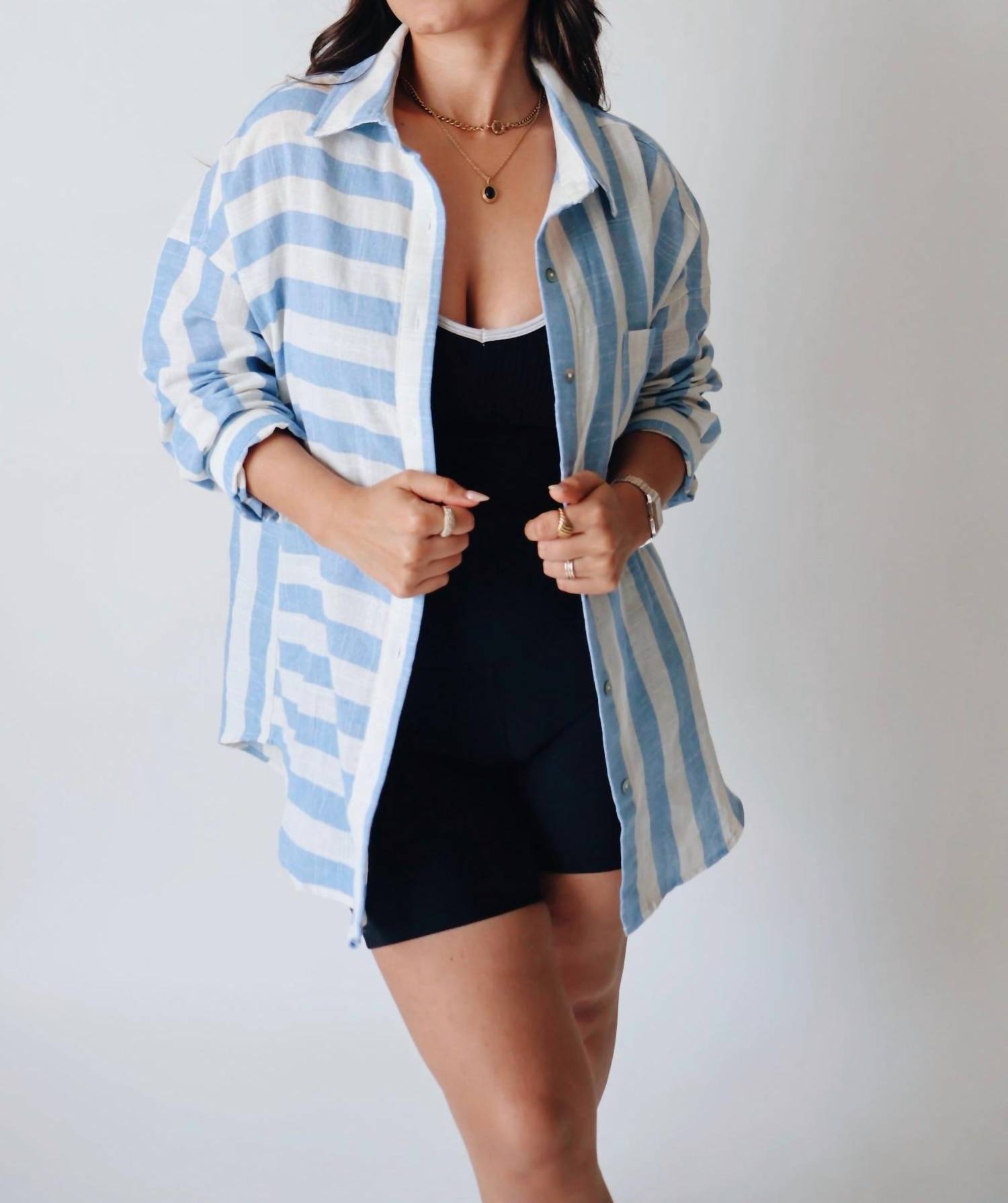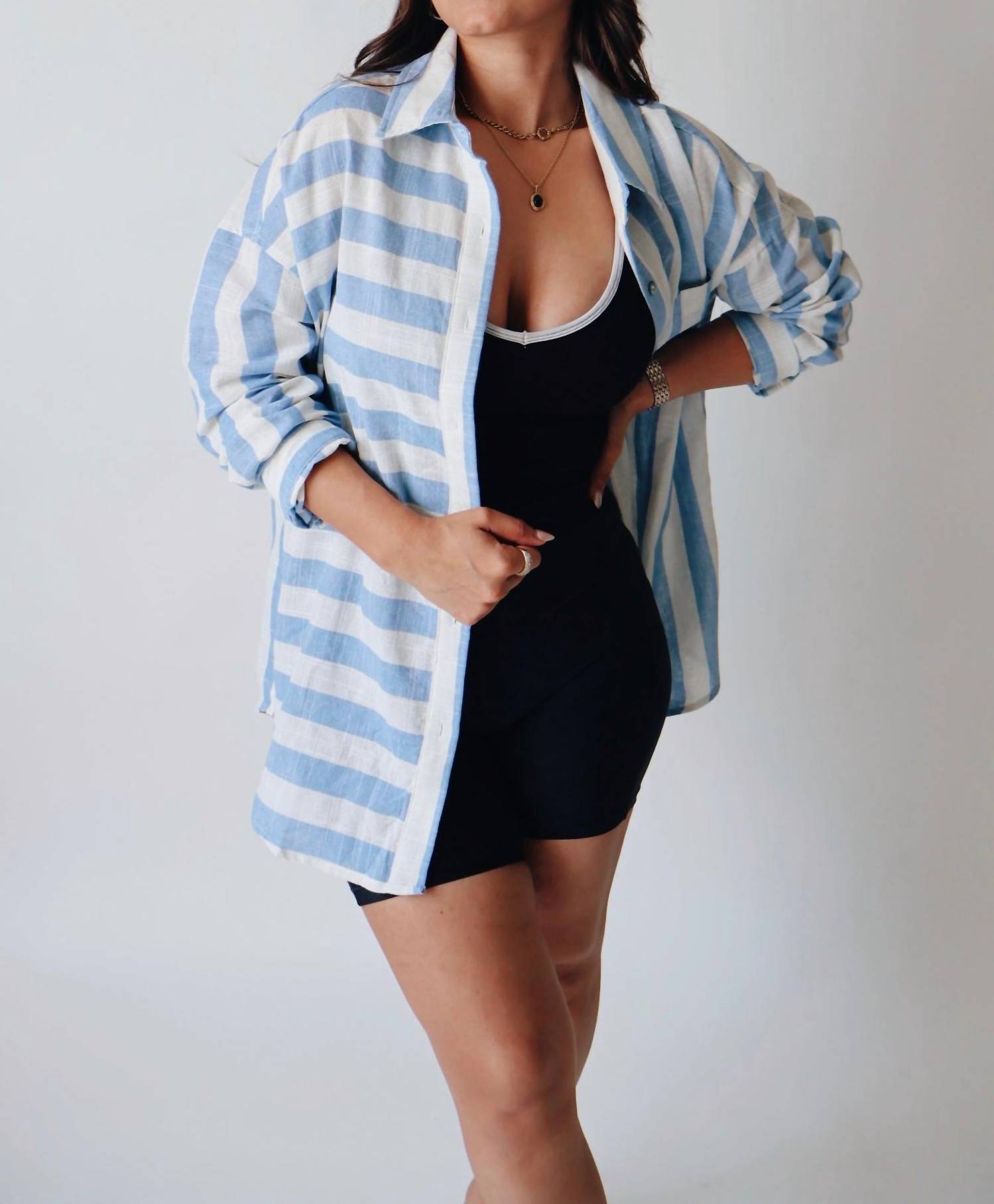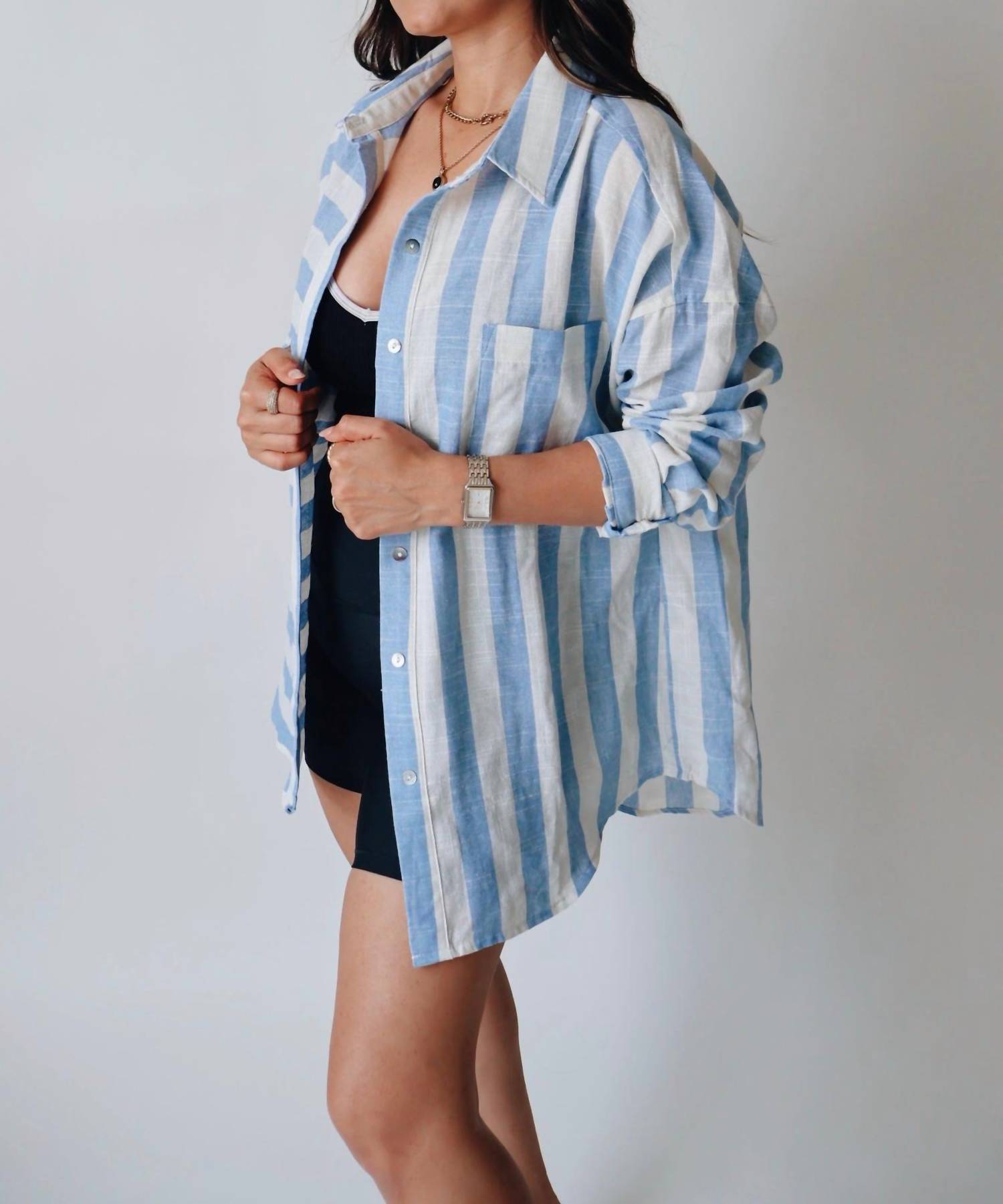 A classic button down shirt that will never go out of style. Introducing the Skyler Striped Shirt by PAPERMOON, a chic long sleeve button-down designed for women with a relaxing fit. This cotton-linen blend combines 70% cotton and 30% polyester, ensuring comfort and style with its natural and sky blue striped pattern. Crafted with a collar and convenient button closure, this piece measures 25" in length from size small. Care is simple with machine wash instructions, making it an ideal addition to any minimalist spring wardrobe.
