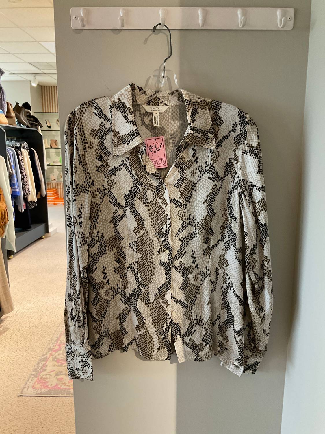 This button down shirt is comfortable yet polished. Elevate your style with the Women's Snake Print Blouse by Part Two, a sophisticated choice for any holiday party this spring. This chic blouse features long sleeves and a classic collar neckline, effortlessly embodying the animal print trend in a subtle beige tone. Closure: Button closure. Ideal for adding a touch of elegance to your wardrobe, this blouse pairs beautifully with both casual and formal ensembles.