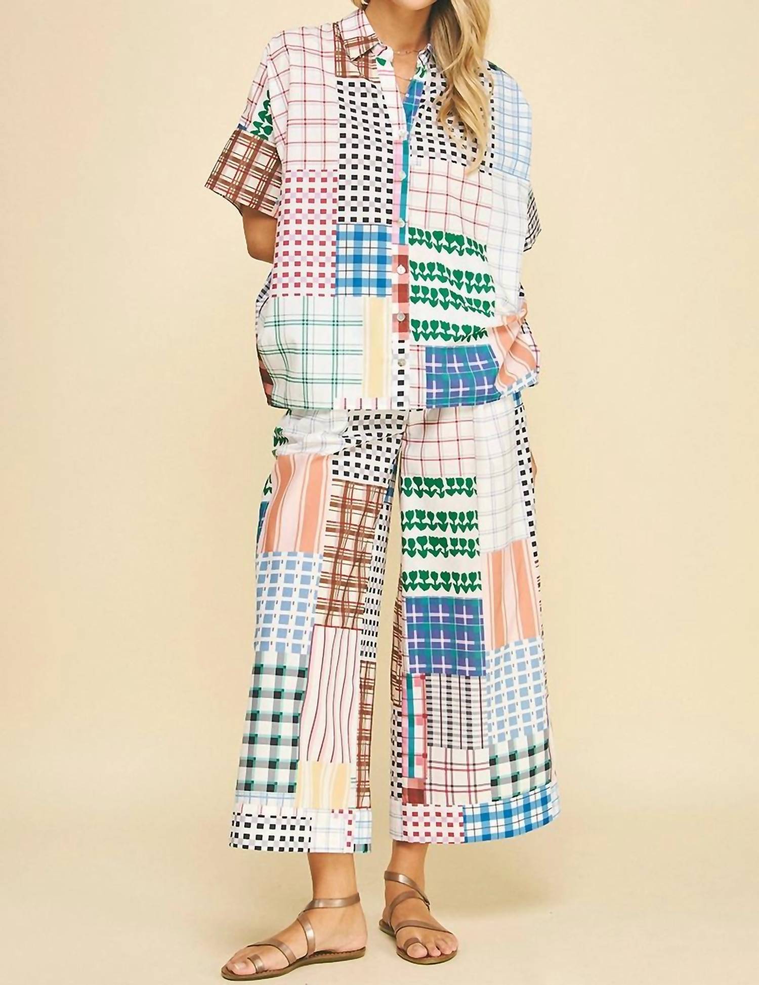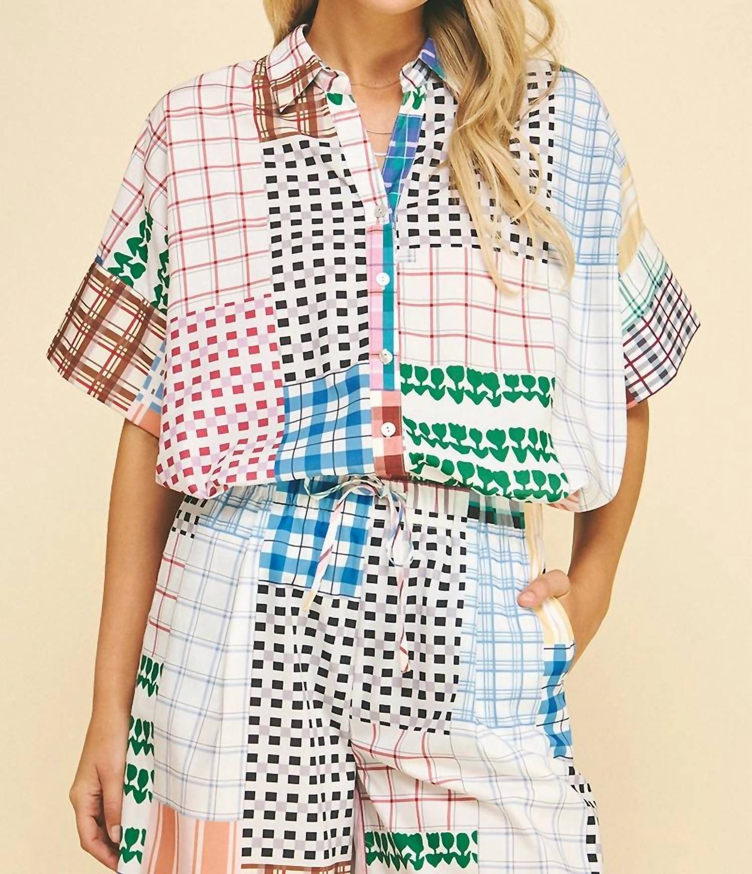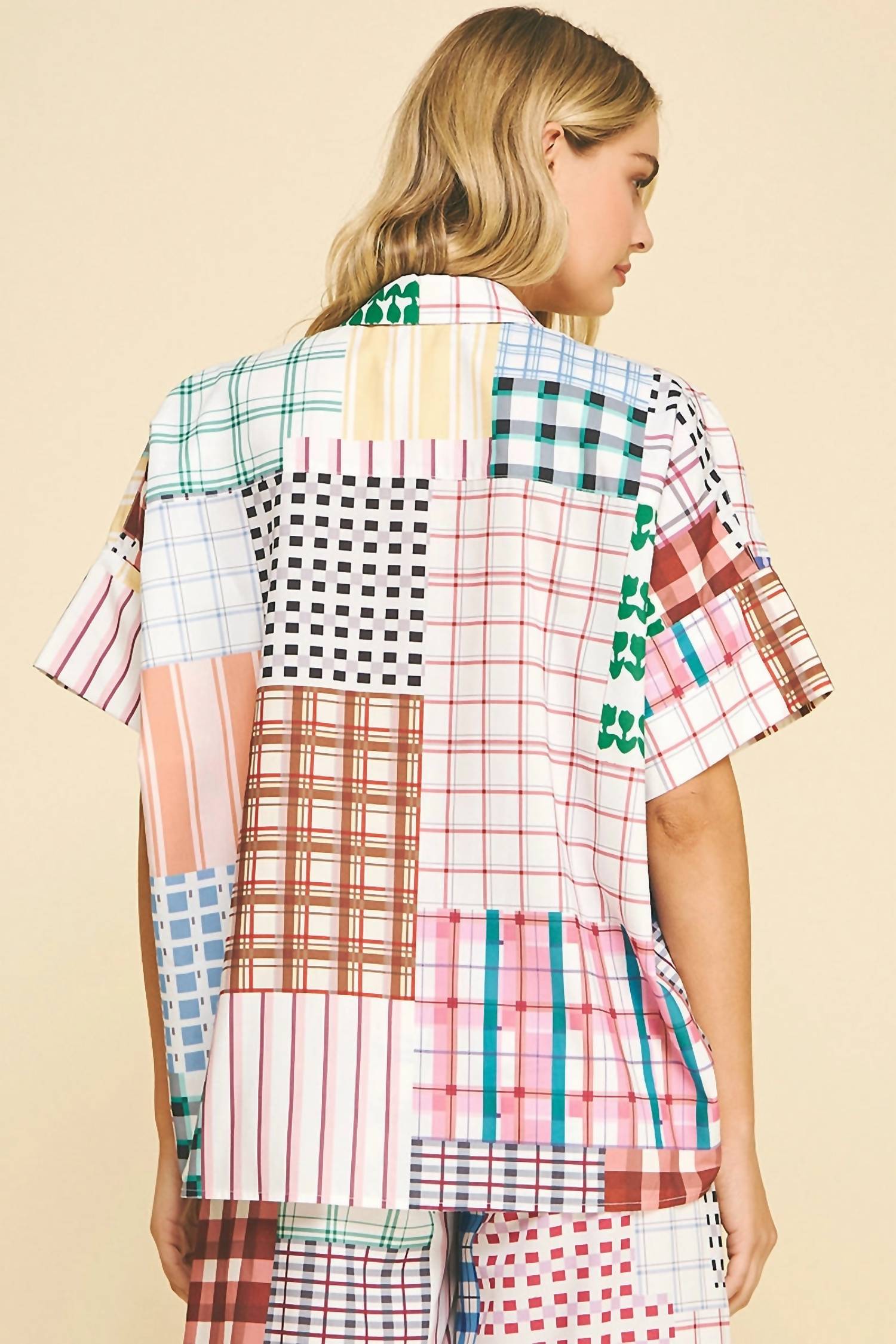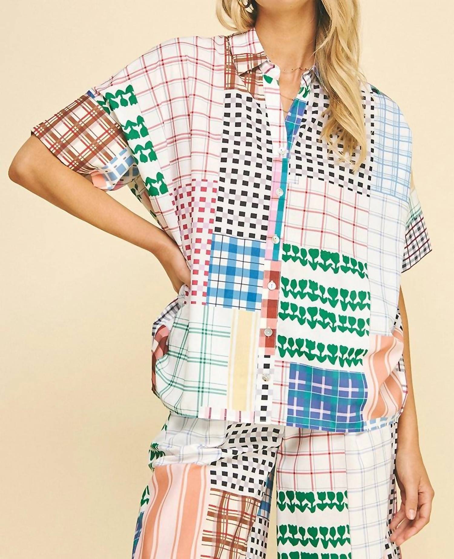 Perfectly tailored and soft to the touch. Elevate your wardrobe with the Marisol Button Front Top by PINCH, a must-have for the spirited fashion enthusiast. This short sleeve, oversized top features a vibrant mixed patchwork print, complemented by a classic collar and a stylish high-low hem. Composition: 100% Polyester. Closure: Button closure. Care: Hand wash cold, line dry. Made in China, this piece blends effortless style with chic functionality for any occasion.
