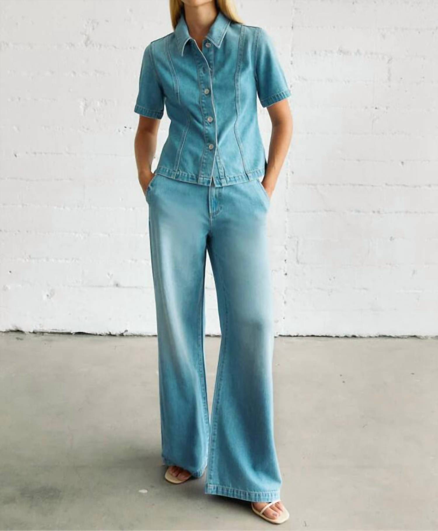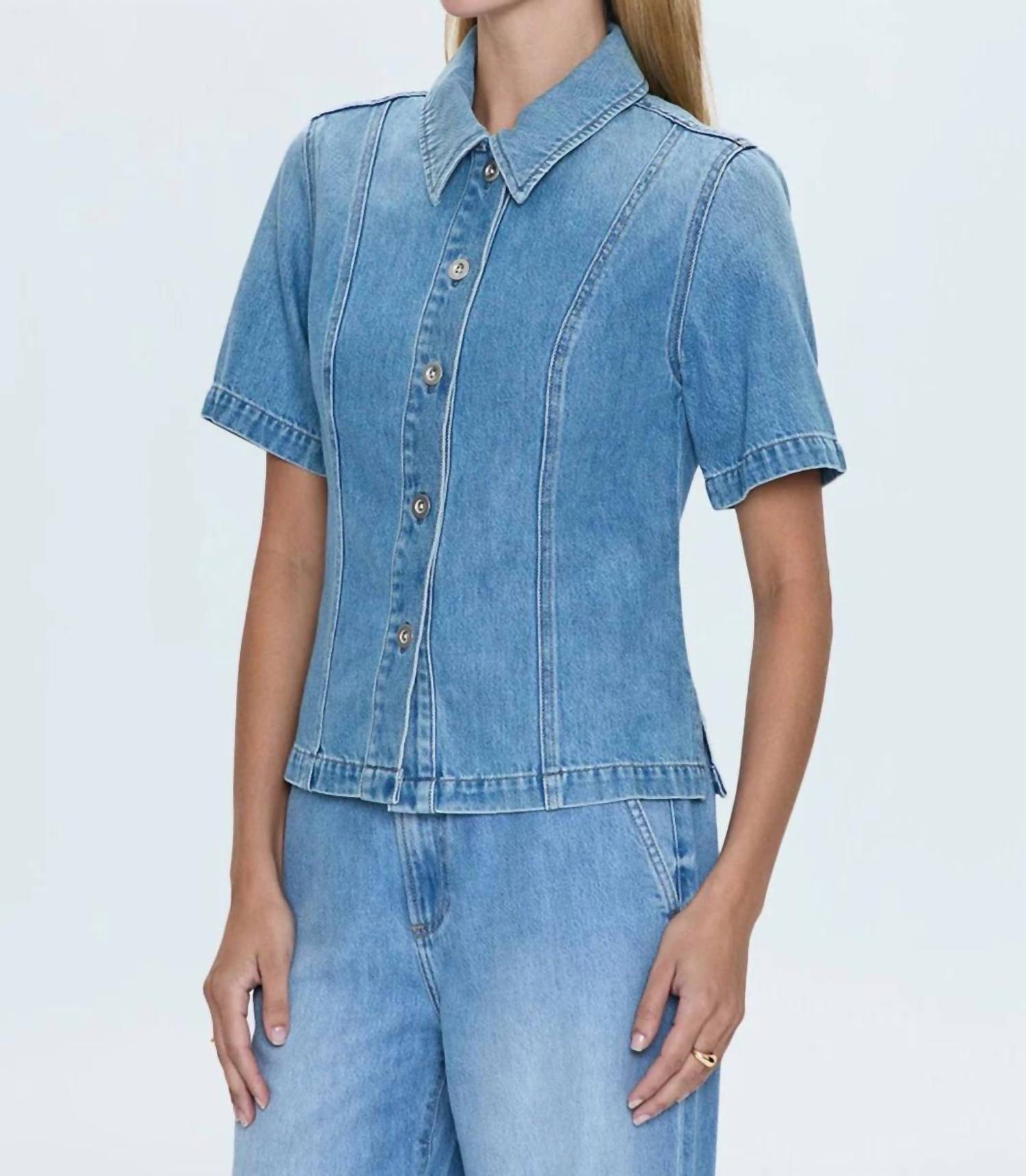 Perfectly tailored and soft to the touch. Introducing the Cyndi Denim Shirt by PISTOLA, designed for a slim, flattering fit in the subtle charm of Palo Alto's mid indigo hue. With short sleeves and a refined collar, this shirt is crafted from a luxurious blend of 62% Cotton and 38% Lyocell. Measuring 23 1/3” in length, it offers a sleek silhouette perfect for a dinner party. Closure is via a button design, and it maintains its softness with cold washing. Model is 5’9” wearing a size Small.