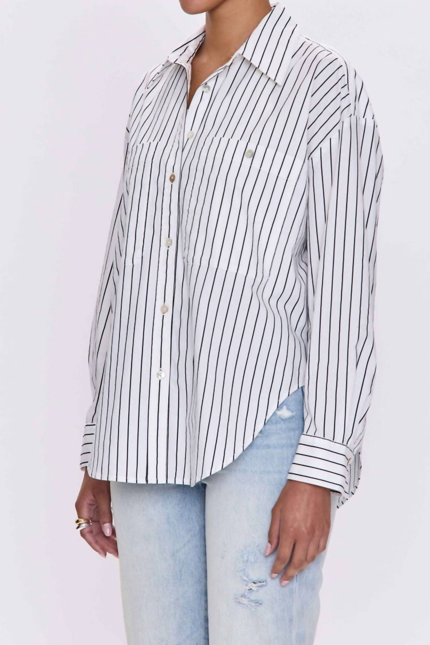 This button down shirt is comfortable yet polished. Elevate your wardrobe with the Samantha Oversized Button Up Shirt by PISTOLA, offering a relaxed boyfriend-style fit ideal for casual outings. This long sleeve shirt is crafted from a comfortable cotton blend comprising 97% cotton and 3% spandex. It features a striking Noir Le Blanc Stripe pattern, complete with buttoned chest pockets and a traditional collar. Closure: Button closure. Care: Machine wash, tumble dry.