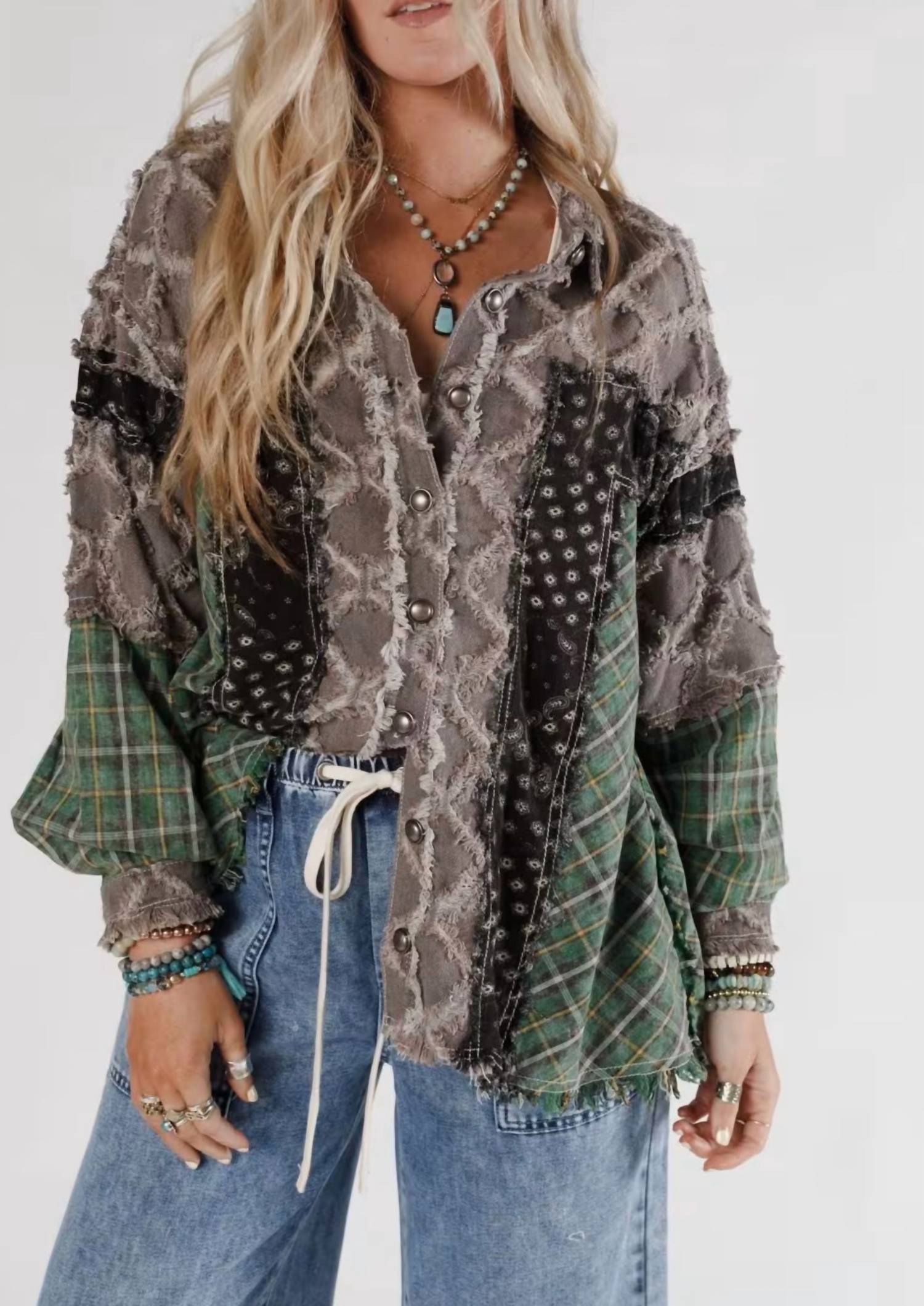 This button down shirt is comfortable yet polished. Introducing the Long Sleeve Contrast Textured Shacket by POL, perfect for adding a Boho Chic flair to your wardrobe. This chocolate brown piece offers a long-sleeve design with a collar neckline and button closure, crafted from 100% cotton for a cozy, relaxed fit. The shacket is highlighted by a fun mix of plaid and floral patches, textured with raw edges and exposed seams, and given a vintage wash. Care instructions: Machine wash for easy maintenance.