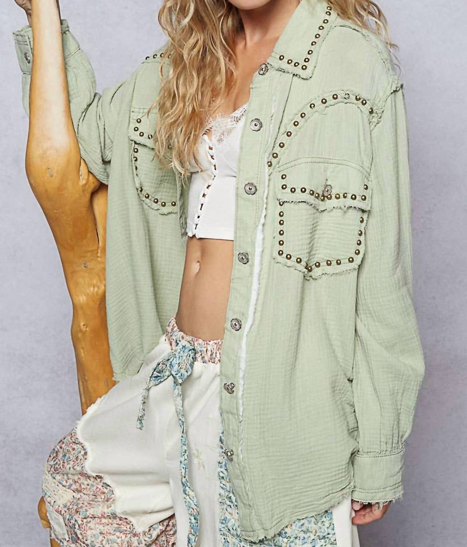 A classic button down shirt that will never go out of style. Meet the Long Sleeve Studded Western Shirt by POL, a chic pistachio green design perfect for a dinner party. Crafted in a roomy fit with western-style yoke and long sleeves, this shirt is made from 100% cotton twill featuring a stylish studded yoke and pocket. Closure: Button closure. Care: Hand wash cold, lay flat to dry, do not wring or twist, cool iron if needed, do not bleach.