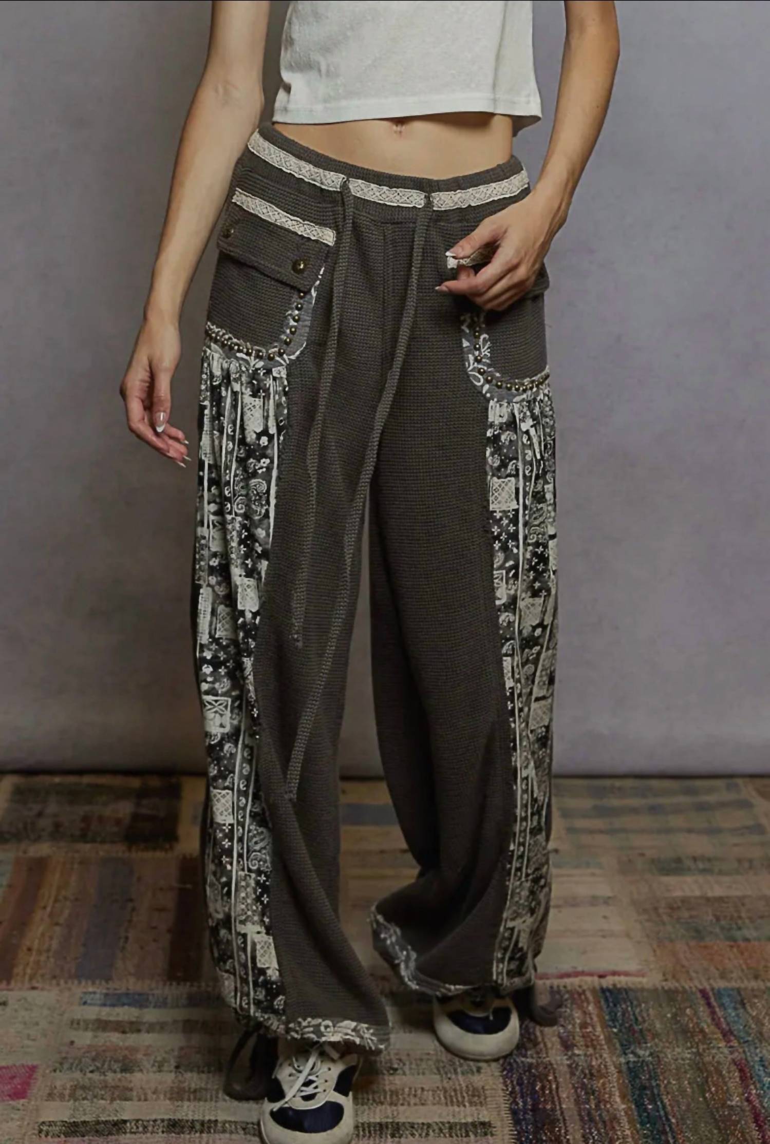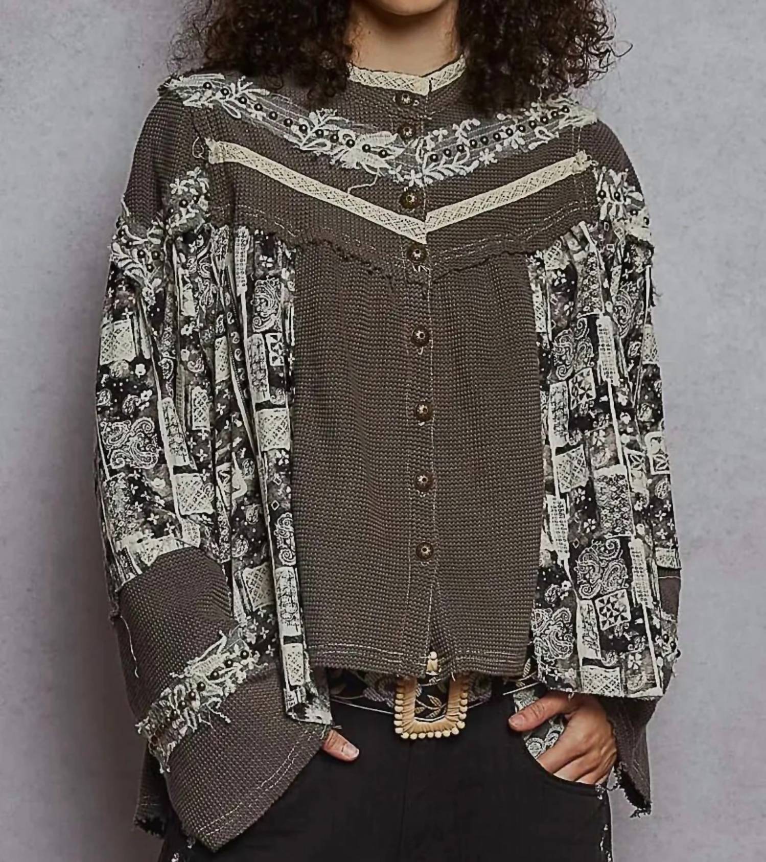 This button down shirt is comfortable yet polished. Elevate your travel wardrobe with the POL Printed Contrast Stud Button High Neck Top & Jogger Set in chic pink. The top boasts long balloon-style sleeves and a high neck silhouette, embellished with lace trim, studs, and floral-patterned panels, providing a relaxed, oversized fit for a bohemian appeal. Complementing the top, the jogger pants feature floral print patchwork, front flap pockets with stud detailing, and a relaxed, wide-leg fit. Crafted from a cotton blend of 62% cotton, 29% polyester, and 3% spandex, this set combines comfort and style with an elastic waistband and adjustable front waist tie, ideal for streetwear-inspired fall travels. Closure is through functional button closures, and care instructions are not specified.