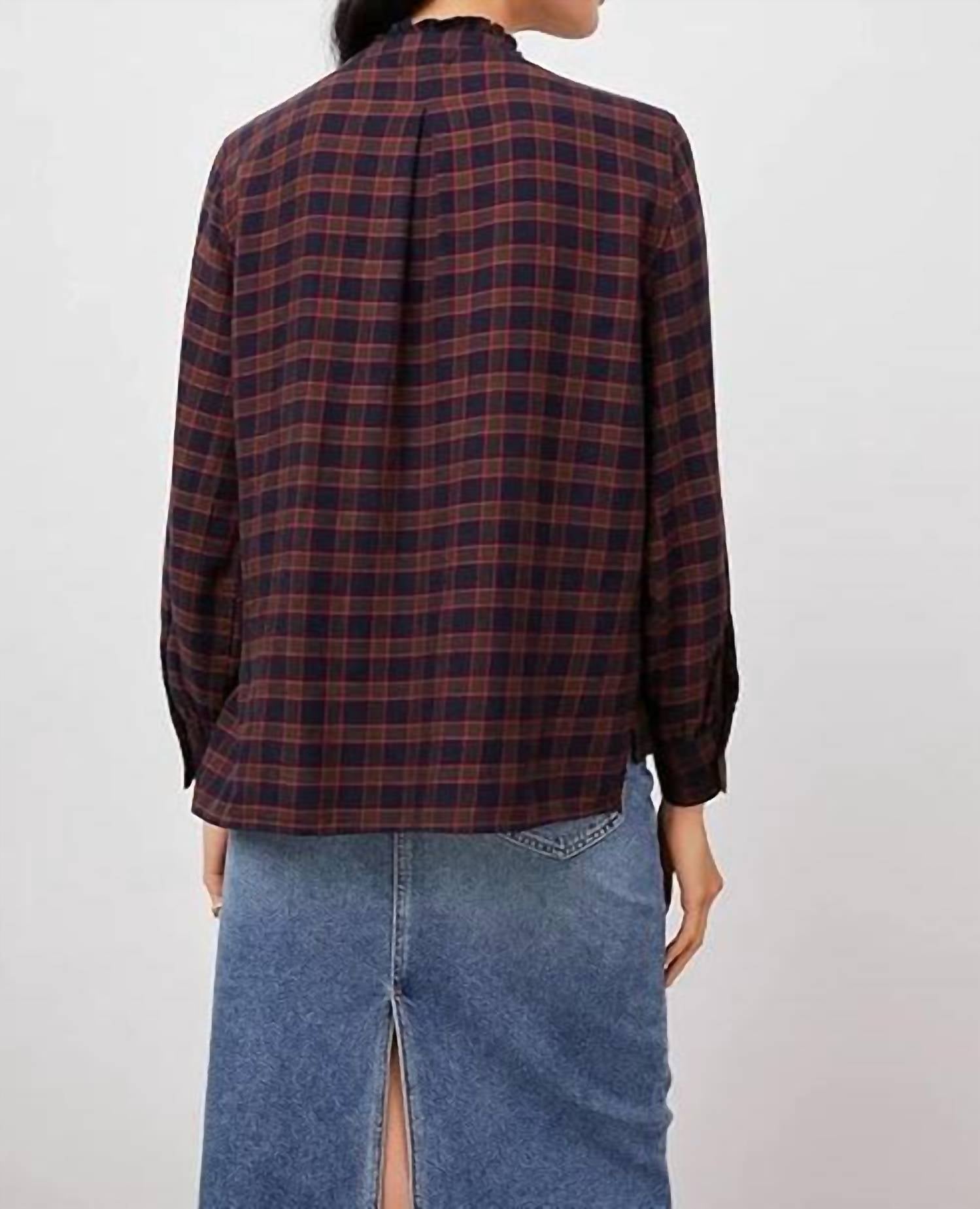 This button down shirt is comfortable yet polished. Introducing the Andie Top by Rails, a chic blend of timeless style and modern flair for your holiday gatherings. This navy, olive, and fuchsia plaid & check button-down shirt features a flattering v-neck and long sleeves, offering a preppy aesthetic perfect for spring occasions. Crafted from a soft 60% Rayon, 40% Cotton blend, it ensures comfort while providing easy elegance without pockets. Closure: Button closure. Care: Machine wash.