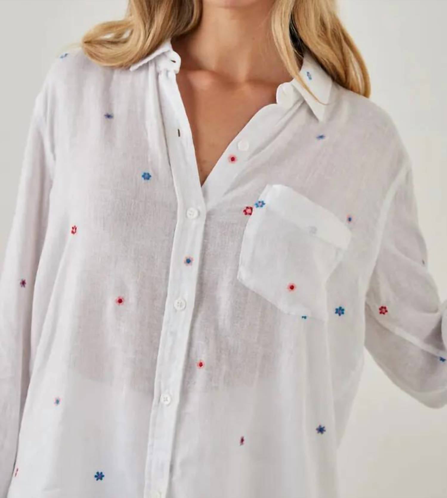 Introducing the Charli Shirt by Rails, a perfect blend of style and function for your warm-weather wardrobe. This elegant button-down features long sleeves and a charming multi daisy embroidery, constructed from a soft 55% Linen, 45% Rayon blend. Its 27-inch length, collar neckline, and practical pockets add a thoughtful touch to your look. Care instructions recommend hand washing and laying flat to dry. Ideal for a summer holiday party, this boho-chic top is a must-have for any fashion-forward woman.