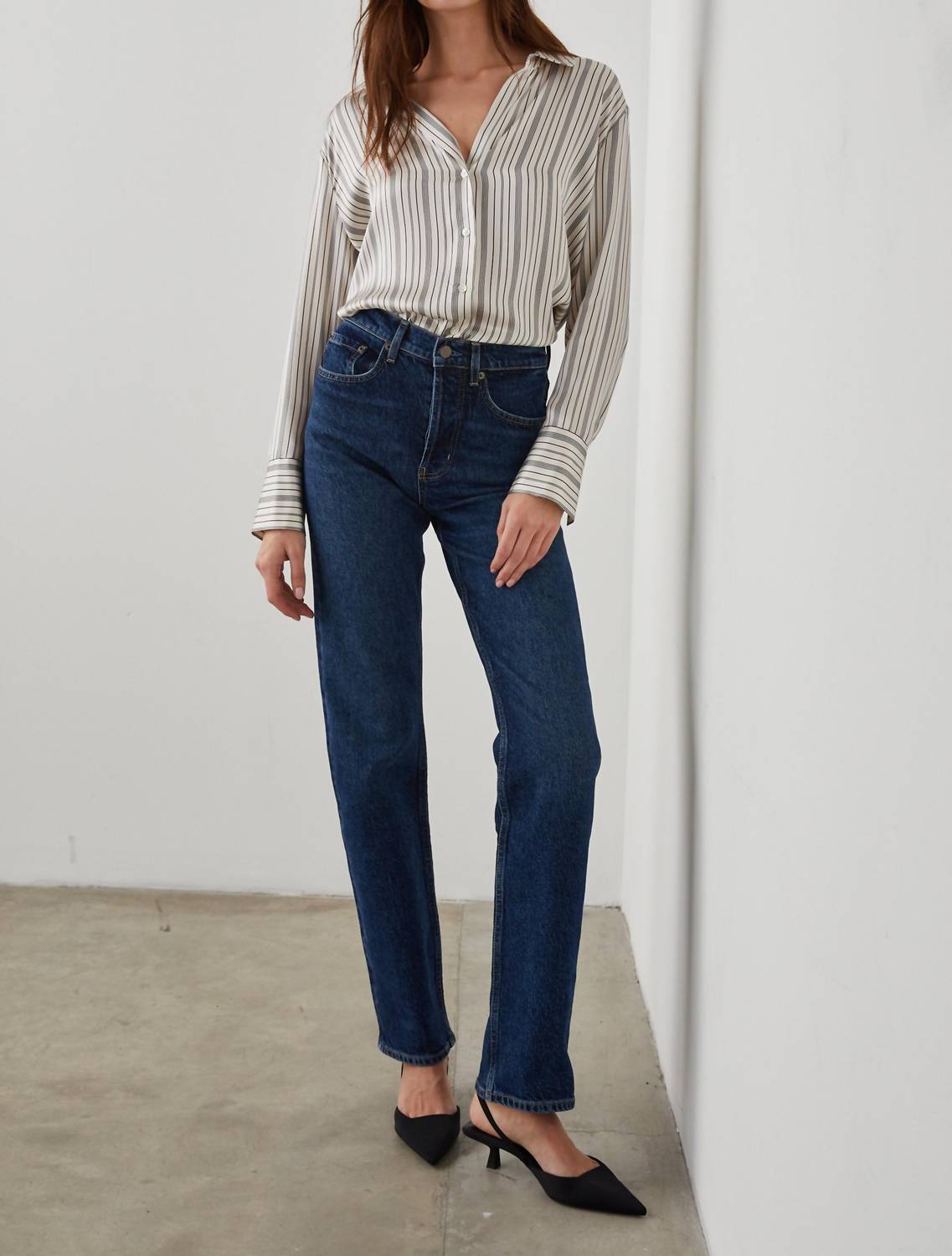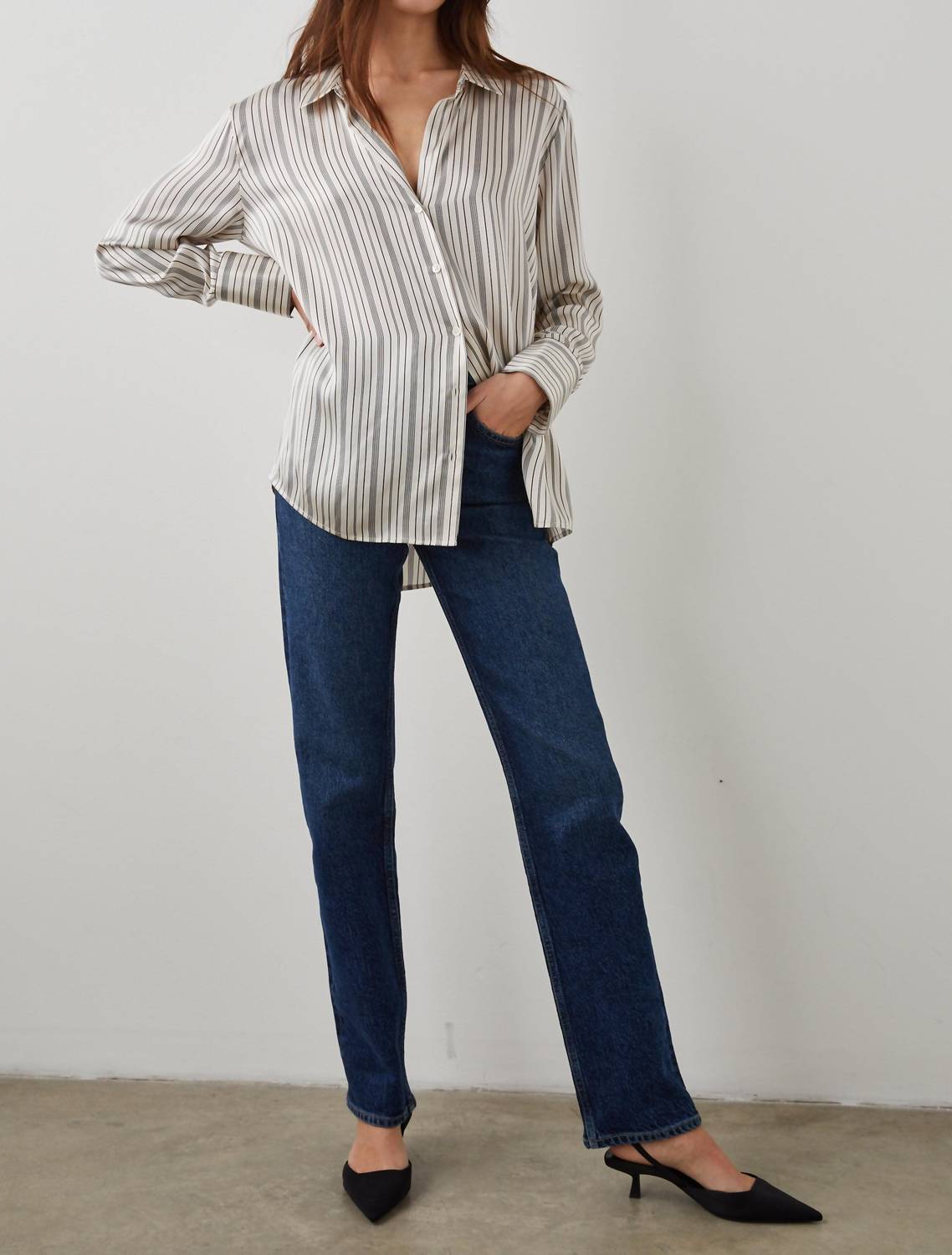 A classic button down shirt that will never go out of style. Experience luxury with the Dorian Button Down Blouse by Rails, perfect for elevating your wardrobe with its Providence Stripe pattern. This long sleeve shirt is expertly crafted from 100% silk charmeuse, offering a relaxed fit and a sophisticated sheen. The drapey collar adds to its elegant charm, while the button closure ensures a classic silhouette. Care for this exquisite piece is simple with dry clean only instructions. Enjoy a front length of approximately 27¼" in size S.