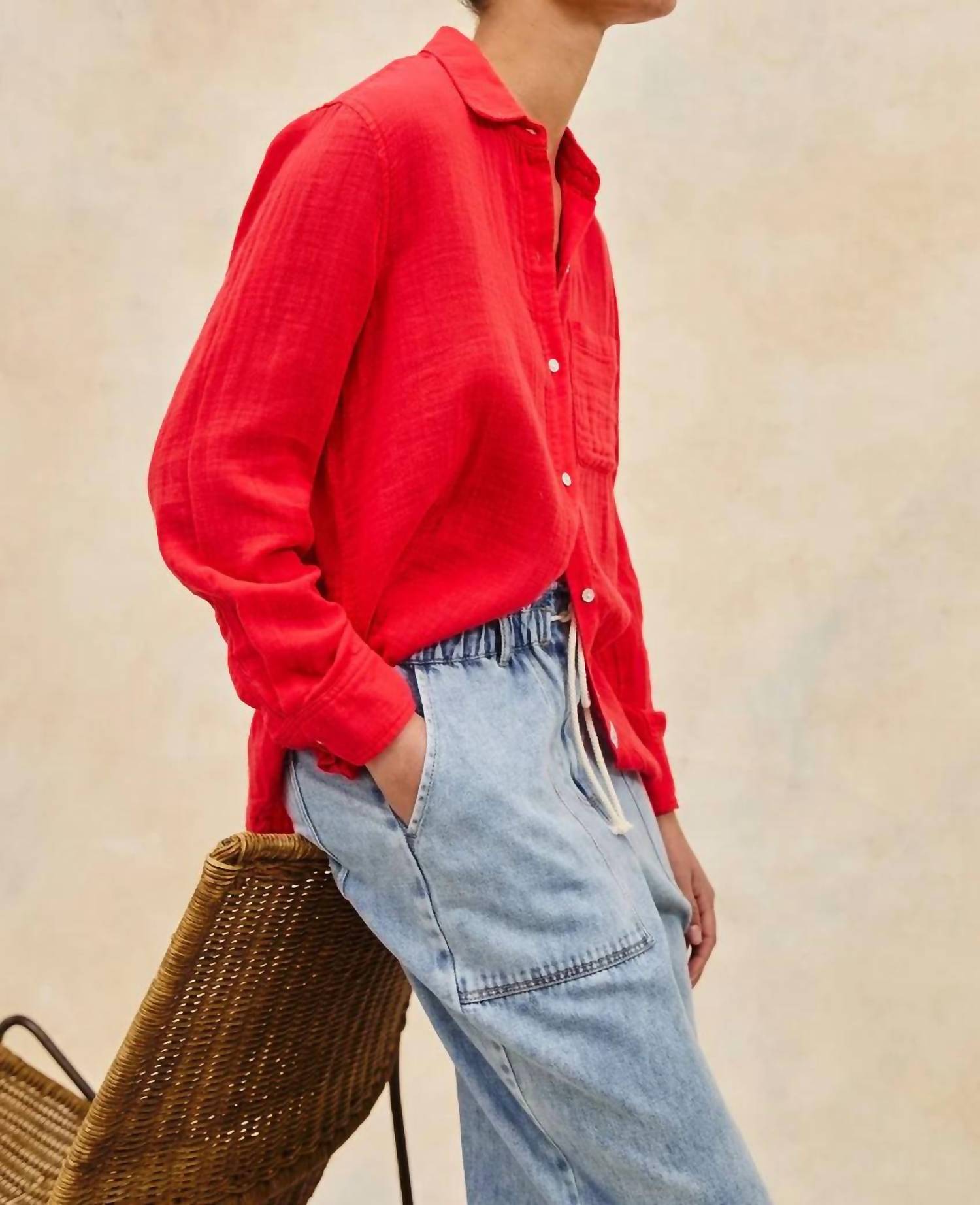 A classic button down shirt that will never go out of style. Introducing the Ellis Button-down Shirt by Rails, an essential piece for everyday elevated comfort with a chic minimalist vibe. This red shirt is crafted from 100% organic cotton gauze, offering long sleeves and a breathable design. It features a single chest patch pocket, classic collar neckline, and is adorned with natural shell buttons. Perfect for a spring dinner party, this plaid and check pattern shirt effortlessly combines style and sustainability.