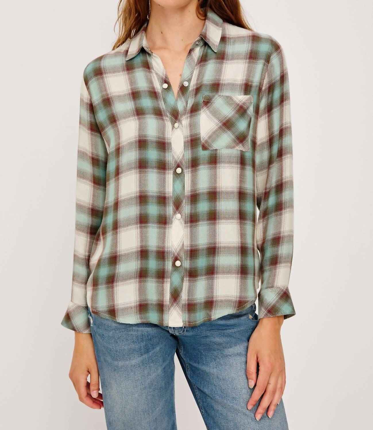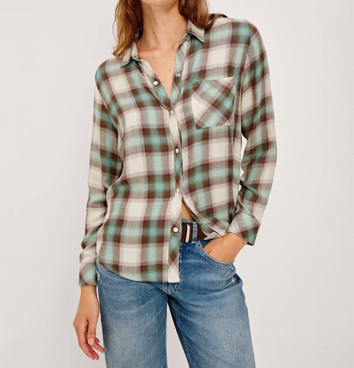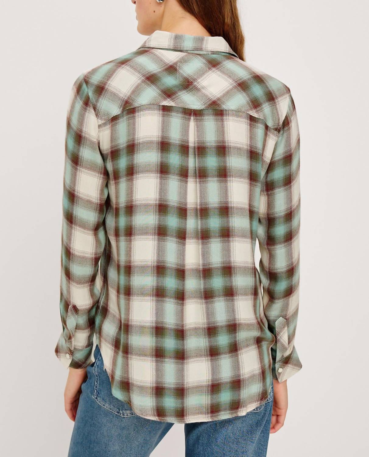This button down shirt is comfortable yet polished. Step out in style with the Hunter Shirt by Rails, an effortlessly chic plaid button-down. This women's long sleeve shirt is crafted from 100% ultra-soft rayon, offering a luxurious feel with its loose twill weave. Featuring a trendy plaid pattern in Birch Olive Teal and a single chest pocket that adds a touch of classic shirting style. Imported and finished with a button closure, it has a front body length of 27 inches. Care is simple with hand washing and hang drying, while a cool iron can be used if necessary.
