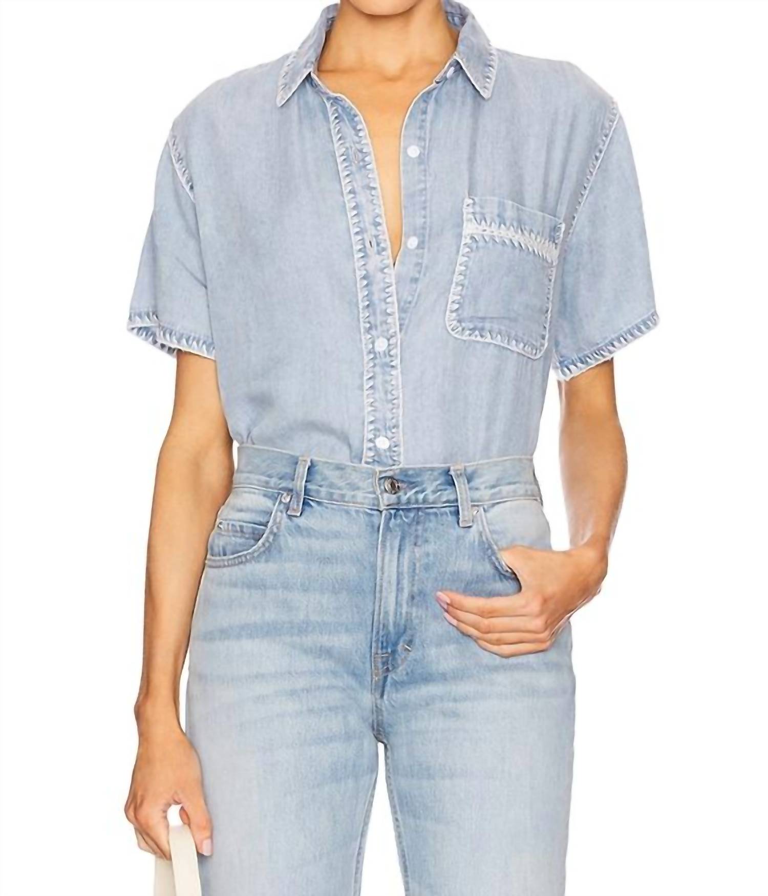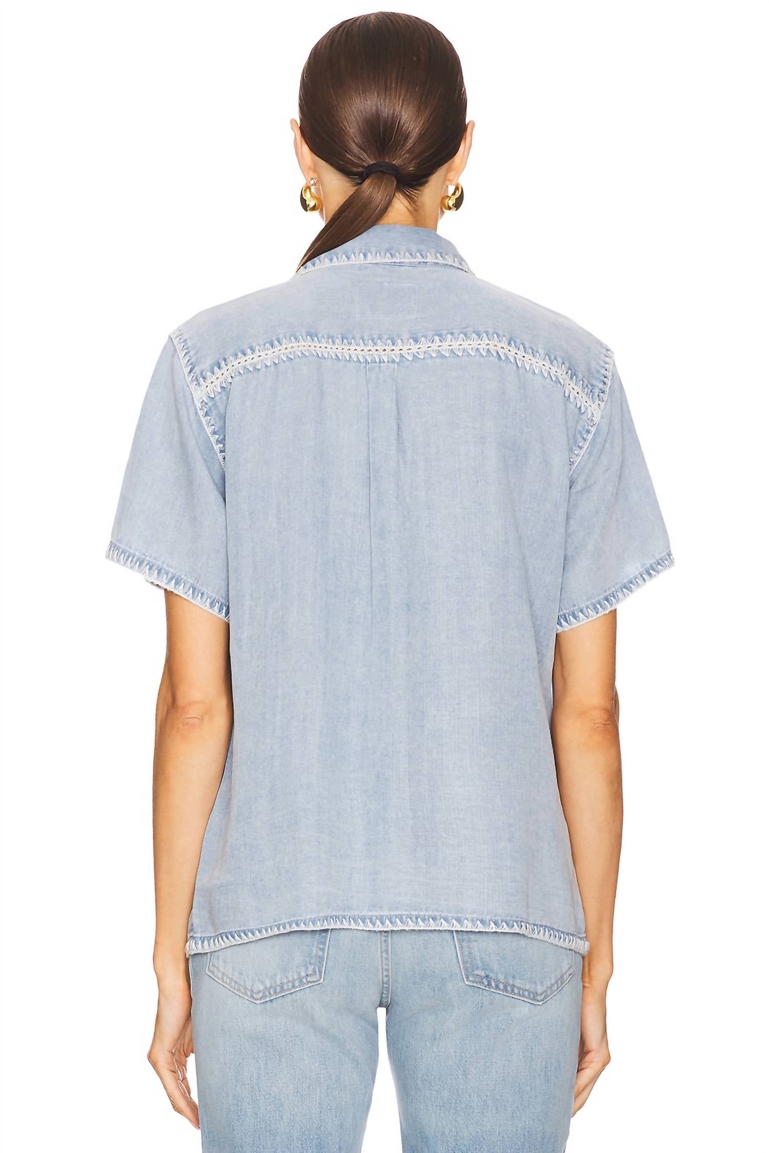 A classic button down shirt that will never go out of style. Elevate your wardrobe with the Lea Top by Rails, a sophisticated addition in Medium Cloud that's perfect for any occasion. This women's button-down shirt features short sleeves and a classic collar neckline, ensuring a timeless silhouette. With practical pockets and a solid pattern, it is both stylish and functional. Care: Machine wash. Closure: Button closure. Ideal for holiday parties or spring outings.