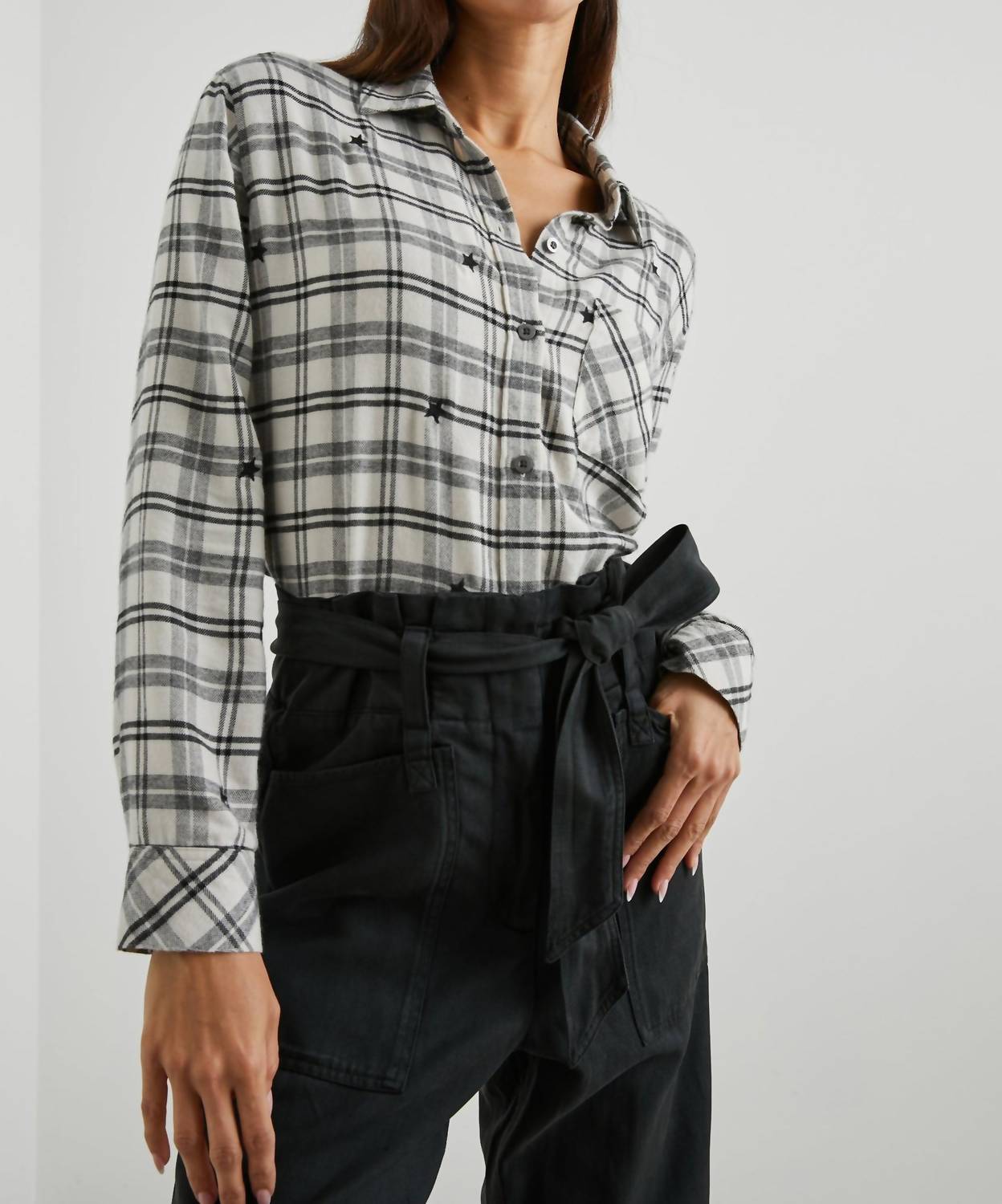 This button down shirt is comfortable yet polished. Introducing the Milo Shirt by Rails, a stylish addition to your wardrobe perfect for spring's preppy trend. Crafted from a soft 60% Rayon | 40% Cotton blend, this long-sleeve shirt in Ivory Check Stars pattern features a practical button closure and convenient pockets, offering both flair and functionality. With a garment length of 26.75 inches, it suits various occasions, from holiday parties to everyday wear. Care instructions include hand washing and line drying to maintain the fabric's quality.